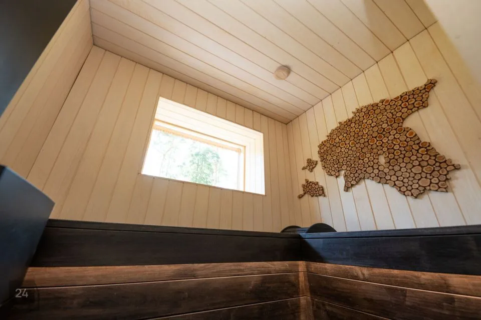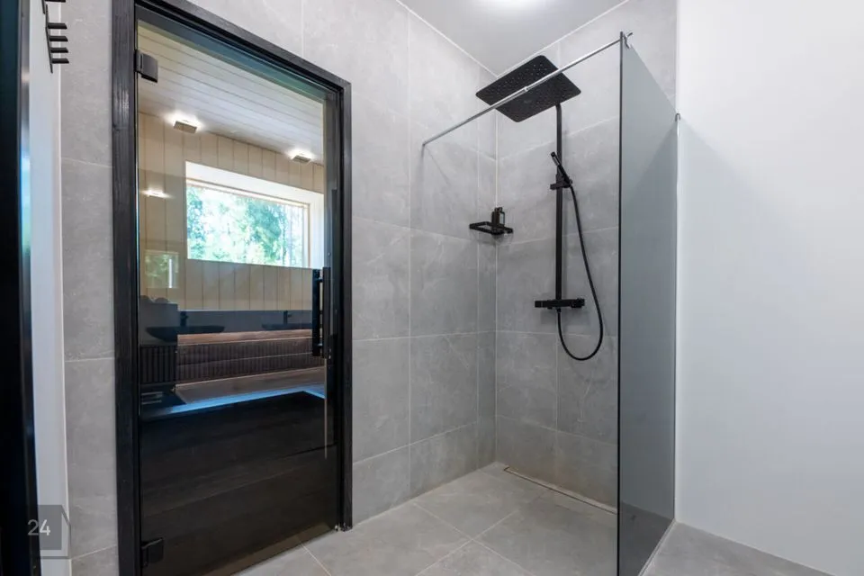 Sauna & Bathroom: electric sauna (Saunum), open shower, double sinks, storage