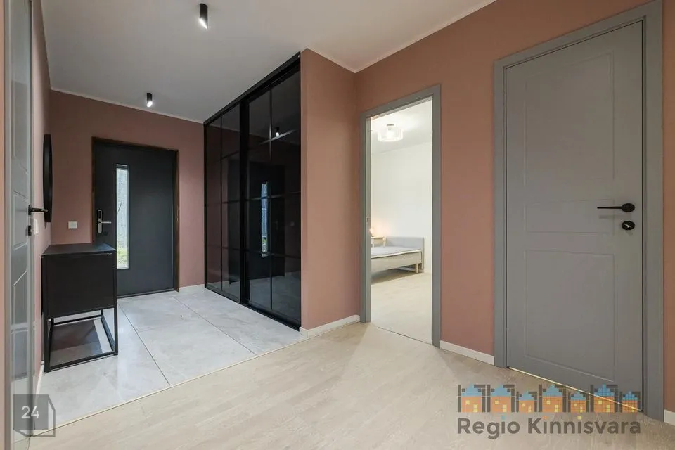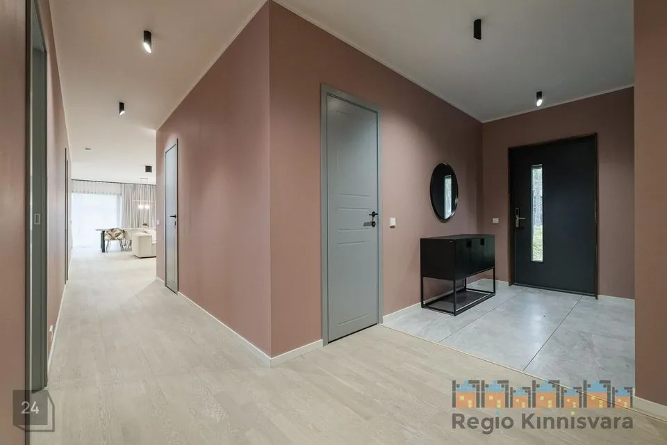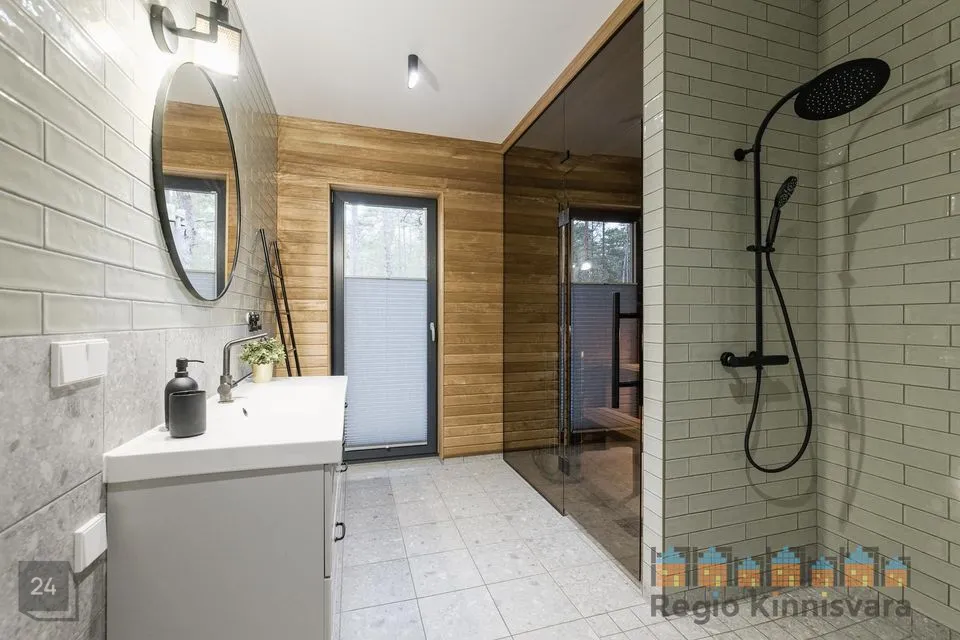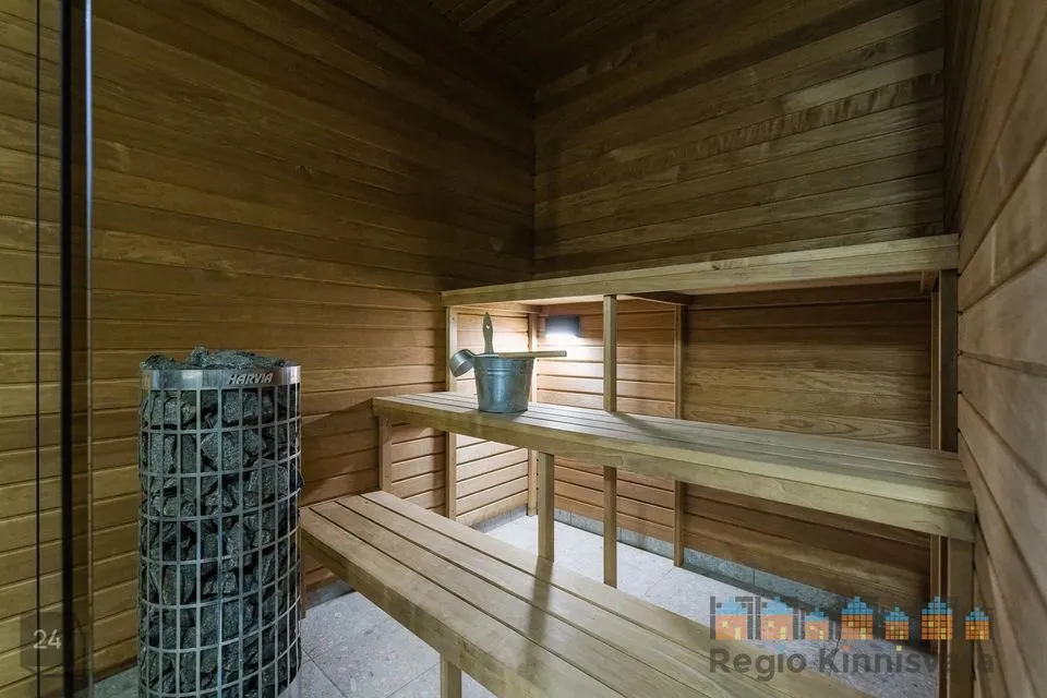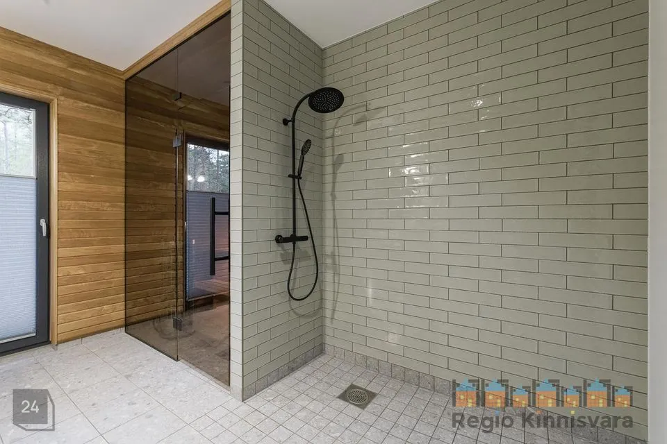 Majas kvaliteetne saarepuidust parkett, niisked ruumid plaaditud. Maja siseuksed on magnetlukkudega eritellimusel valmistatud. Klaasitud seina ja -uksega saun, viimistlus termopuidust, Harvia elektrikeris. Kogu majas olemas vajalik valgustus.