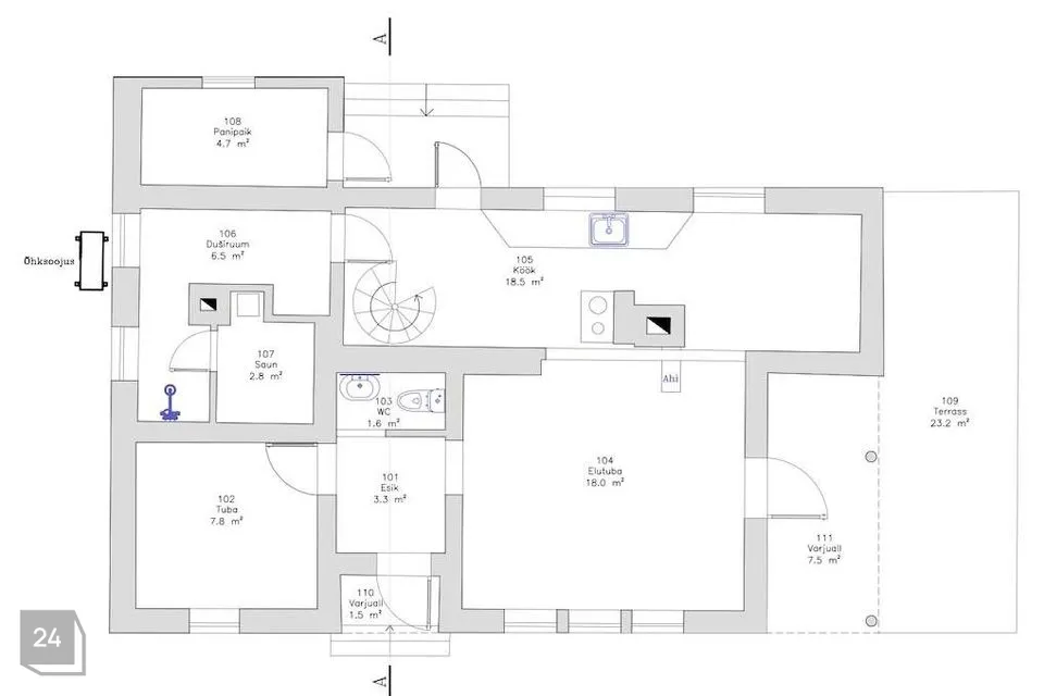 Hoone kokku 92,5m². Lisandub varjualune 7,5m², terrass 23,2m² ning katusealune rõdu teisel korrusel suurusega 3,6m².