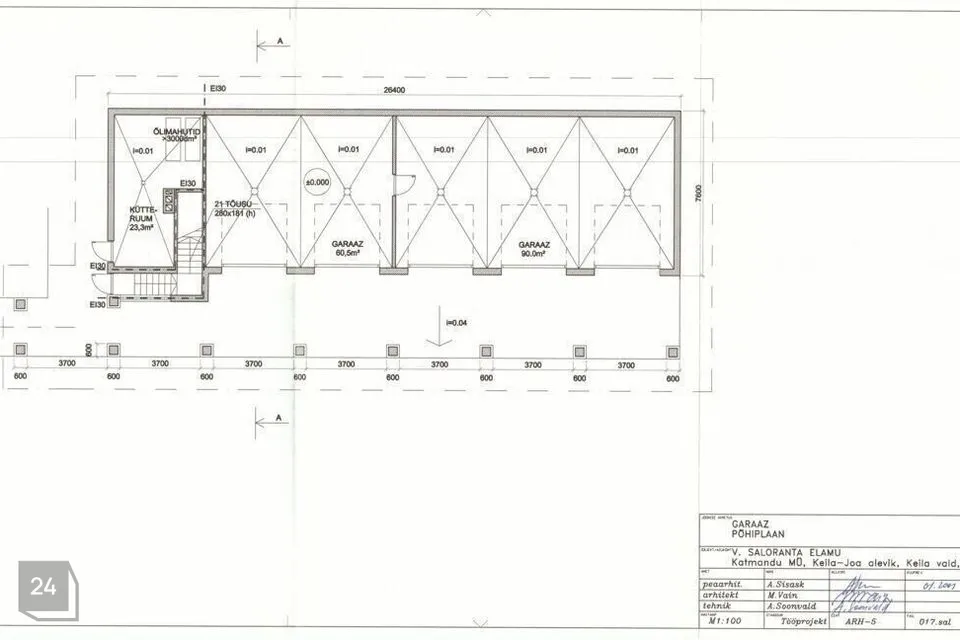 Garaažihoone suurus 174m2, mahutab 5 autot. 90m2 garaažipinnast on kütteta, mahutab 3 autot. 60m2 garaažipinnast on küttega ja mahutab 2 autot. Hoones asub katlamaja, suurus 23m2. Teisel korrusel 3 magamistuba (kokku 86m2) ja hallis eraldiseisev dušš ja wc. Köetavatel pindadel maakütte radiaatorid.