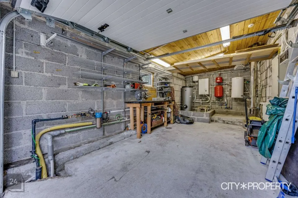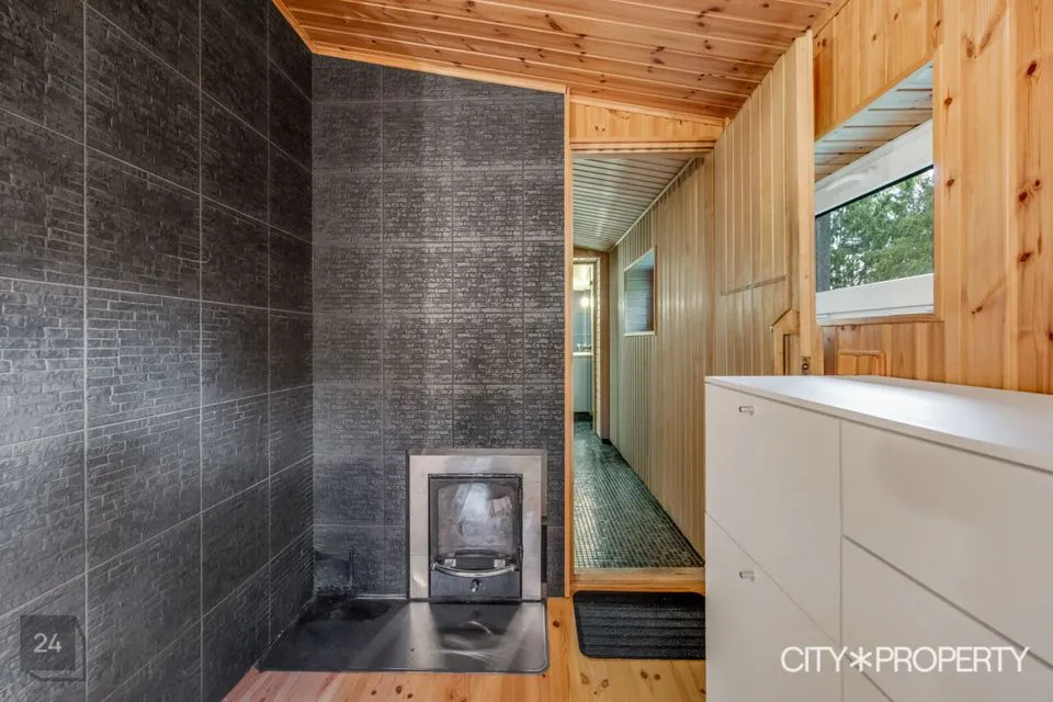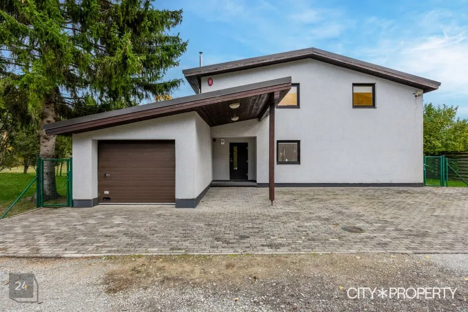 Esik, tualett, avatud köök ja elutuba, vannituba, leiliruum, sauna eesruum- puhkeruum, suur hoovipoolne terrass pääsuga elutoast ja puhkeruumist, garaaž.