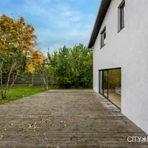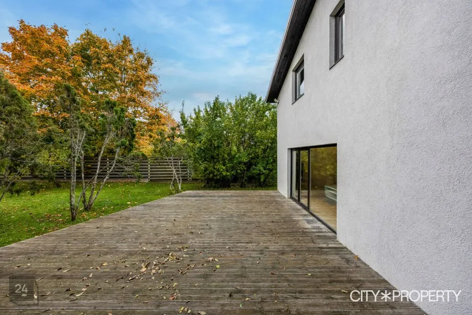 Maja tagumisel küljel paikneb suur terrass, kuhu pääseb mugavalt nii elutoast, kui sauna puhkeruumist.