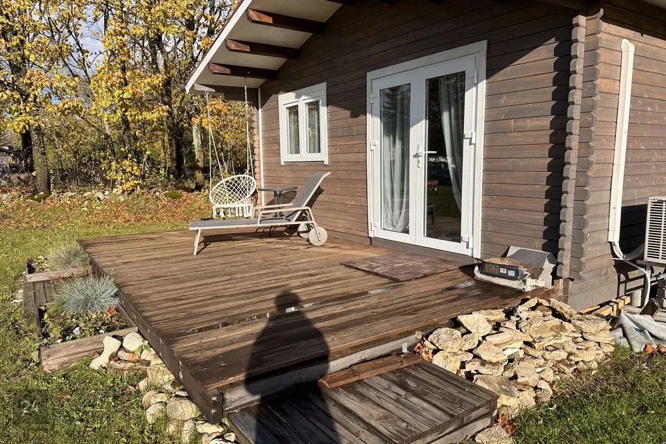 Hoone lõunapoolsel küljel suur immutatud puidust terrass.