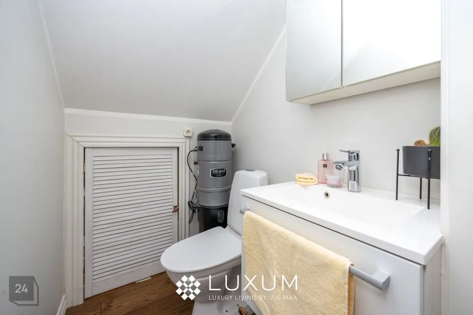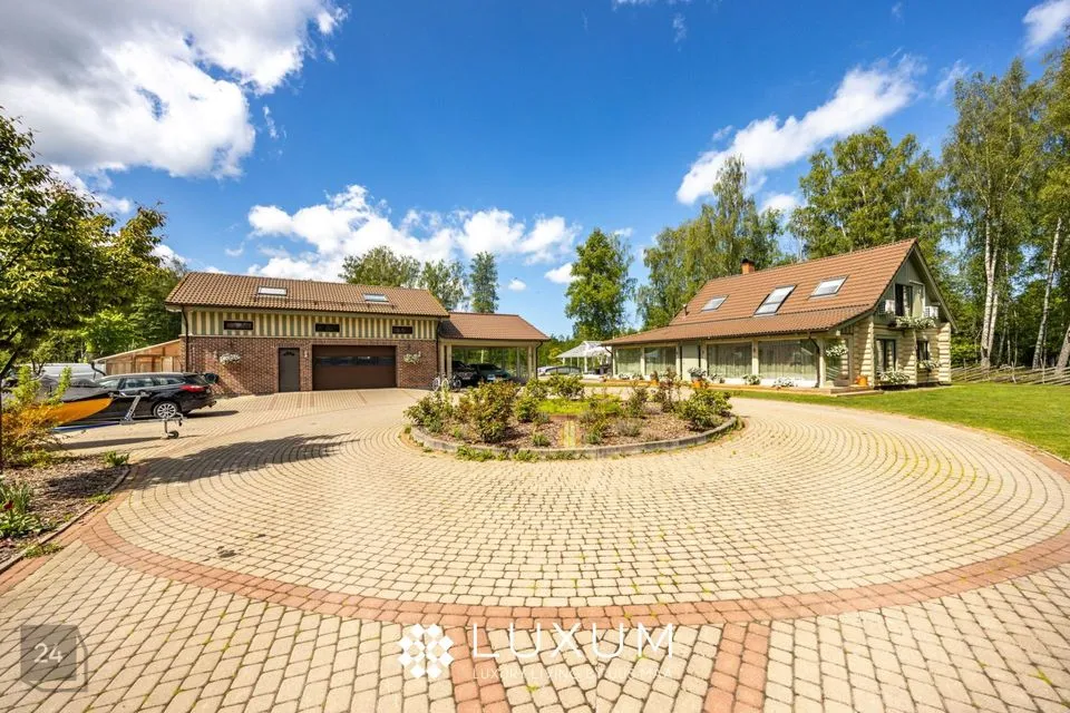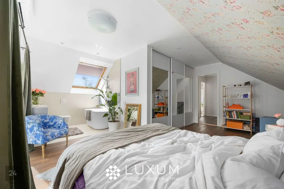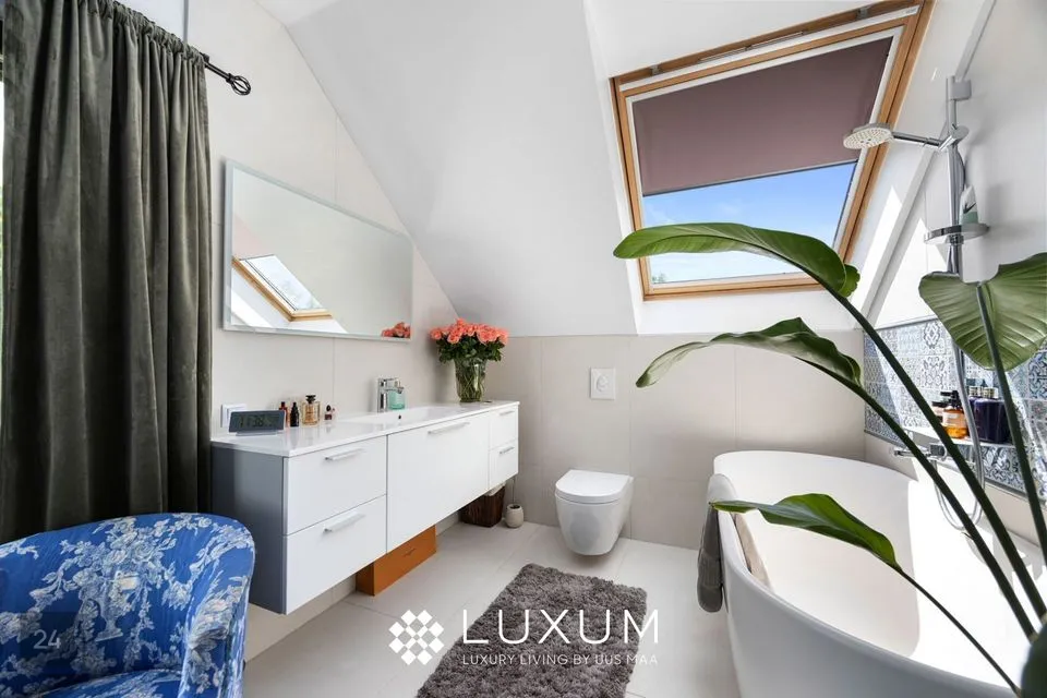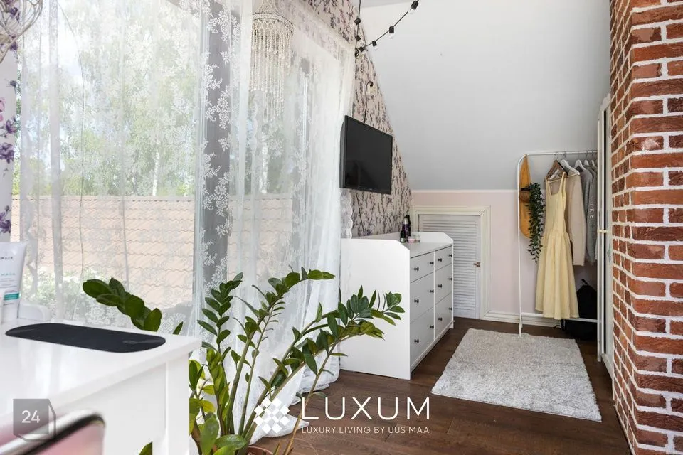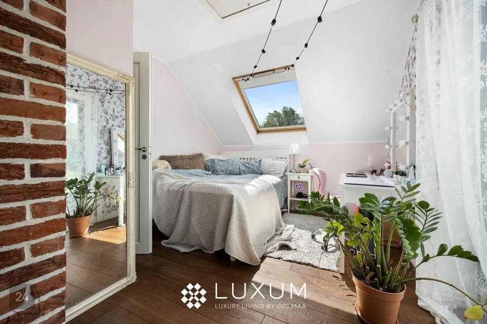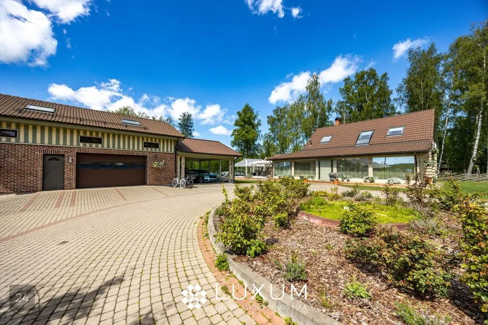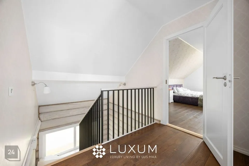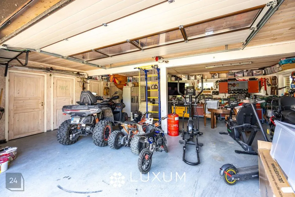 Stiilse arhitektuuriga hoone esimesel korrusel on mahukas garaaz kahele autole ning hoone teisel korrusel on hubased magamistoad (kolm magamistuba) ning üks duśiruum ja tualett.
