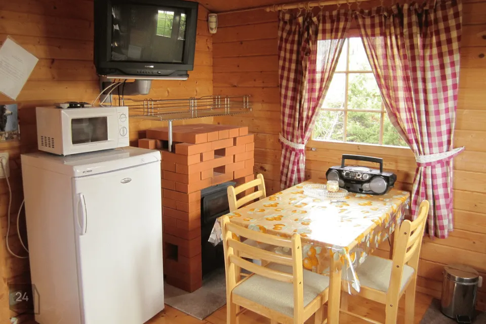 diivanlaud, külmik, lauanõud, veekeetja, teler, raadio,