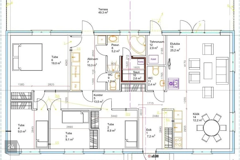 •Ruumilahendus Esik, elutuba-köök, 4 tuba, WC, abiruum, WC, vannituba, saun, terrass.