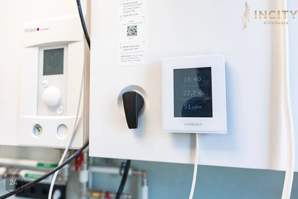 The building has a ventilation system with heat recovery. There is a fireplace in the living room.