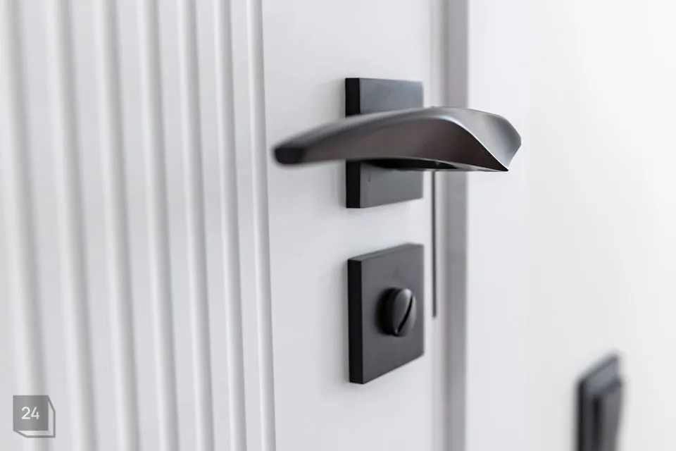 Internal doors: smooth veneered wooden doors in a wooden structure.