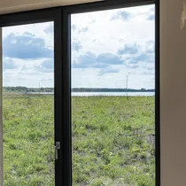 The windows and terrace doors of the building are designed with 3x double-glazed windows in dark-gray frames.
