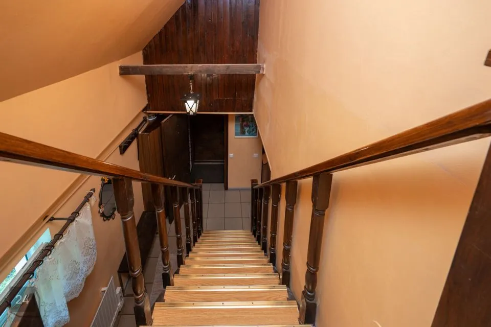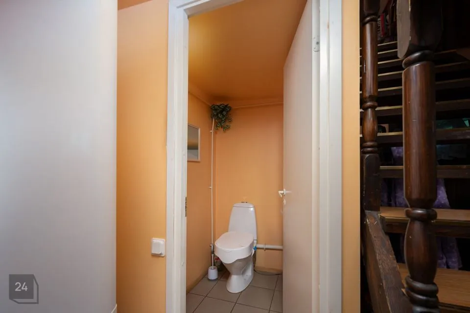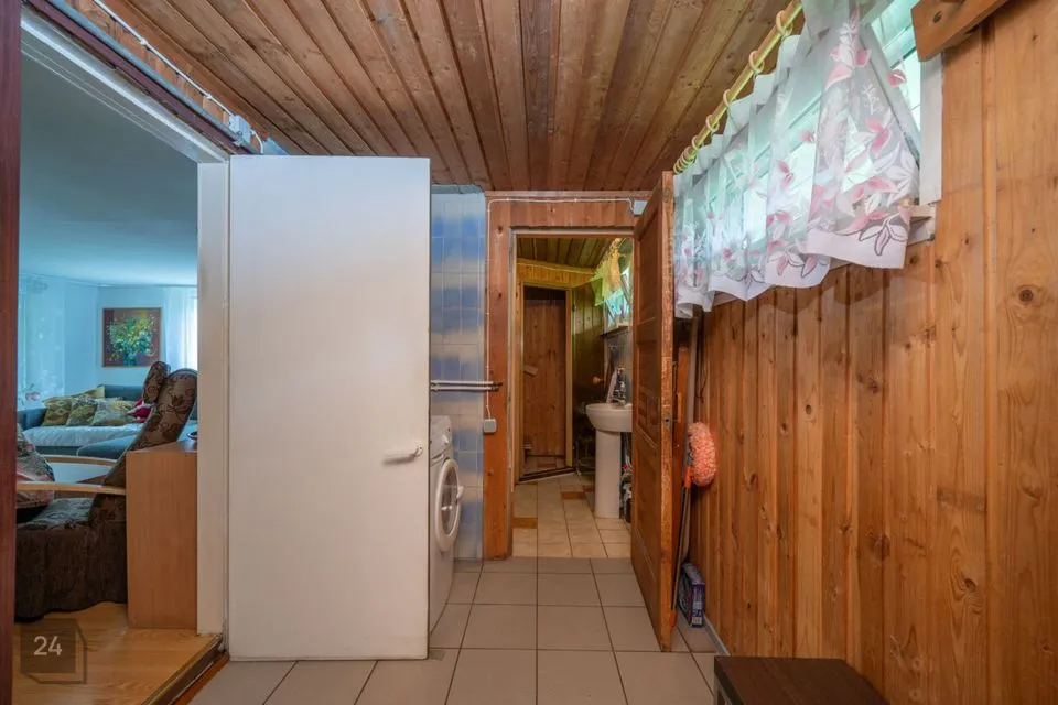 I korrus - elutuba, köök, trepihall, esik, saun, tualett, esik. Väljapääs maja küljele.
