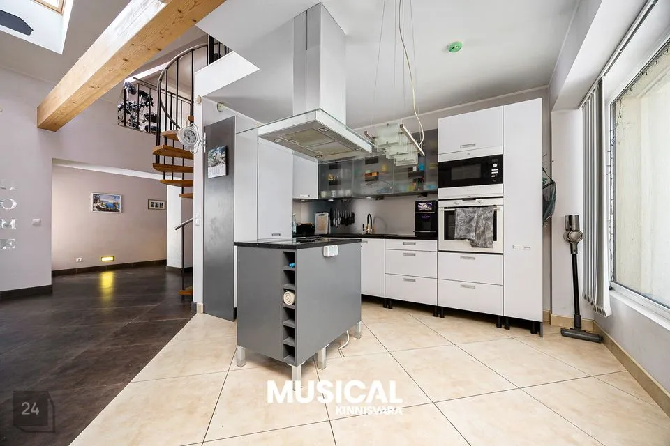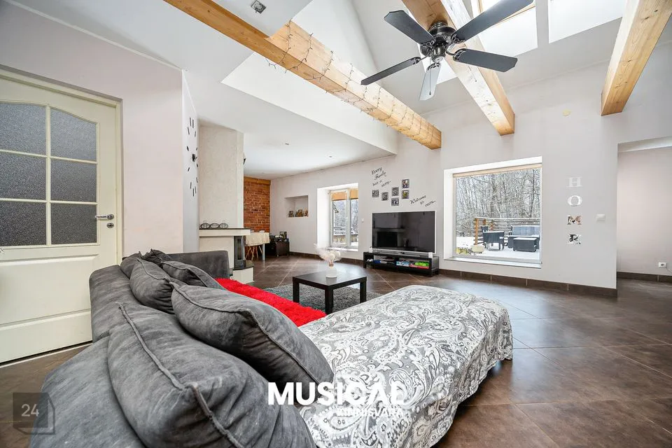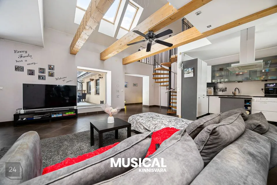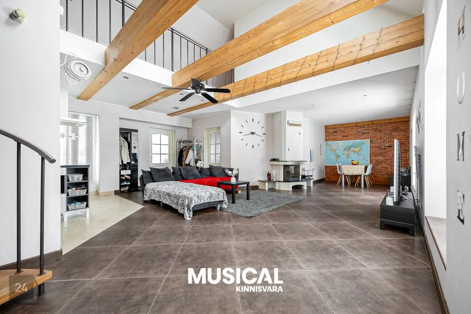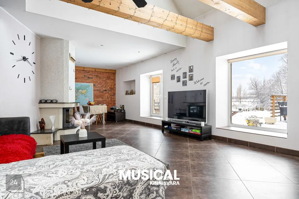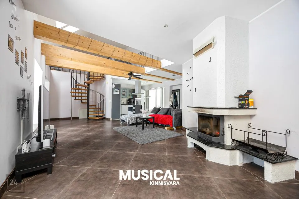 Otse ees ootab suur ja valgusküllane elutuba, mille südameks on kamin – ideaalne, et nautida soojust ja hubasust pimedatel õhtutel. Elutoas on ka avatud lagi, mis ulatub teise korruseni, andes ruumile avaruse ja õhulisuse.