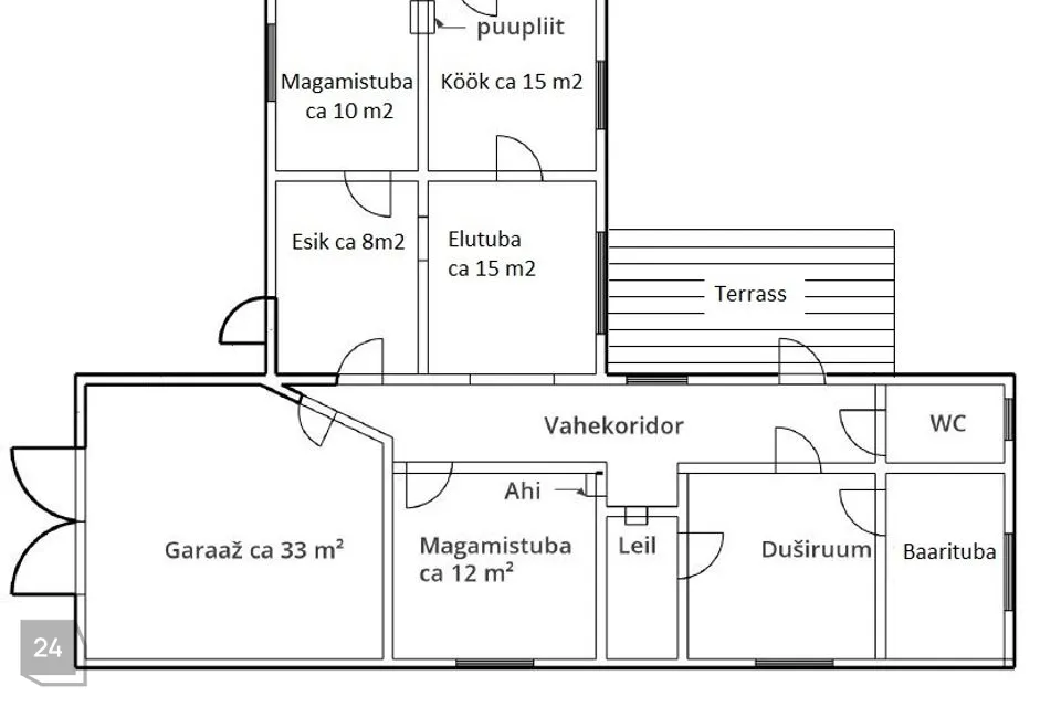 Küte: köögis on puukütte pliit, mille soesein kütab ühe magamistoa, teises magamistoas on ahi, mida saab kütta koridorist. Köögi kõrval asuva magamistoa ahju ei tohi kasutada, vajab pottsepatööd.