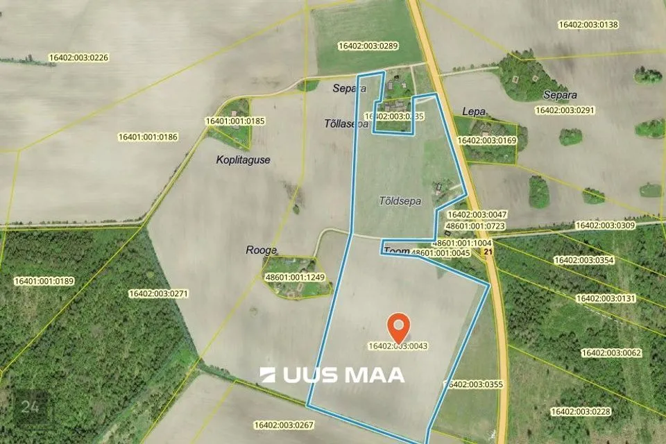 Pakkumine koosneb kahest katastriüksusest, 16402:003:0235 (hoonestatud kinnistu) ja 16402:003:0043 (põllumaa).