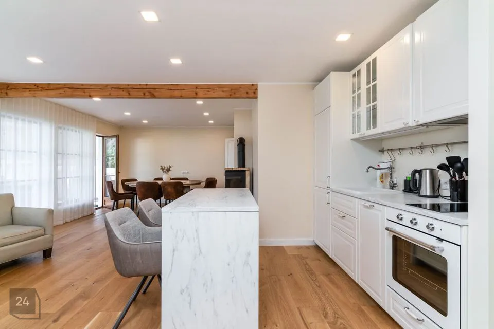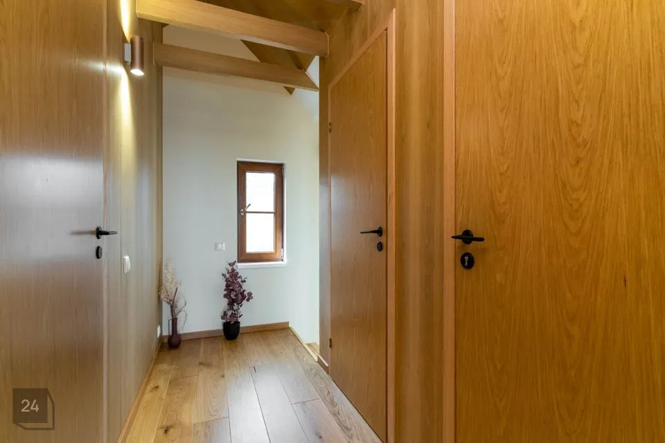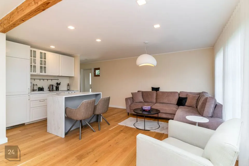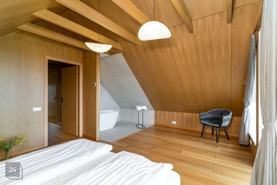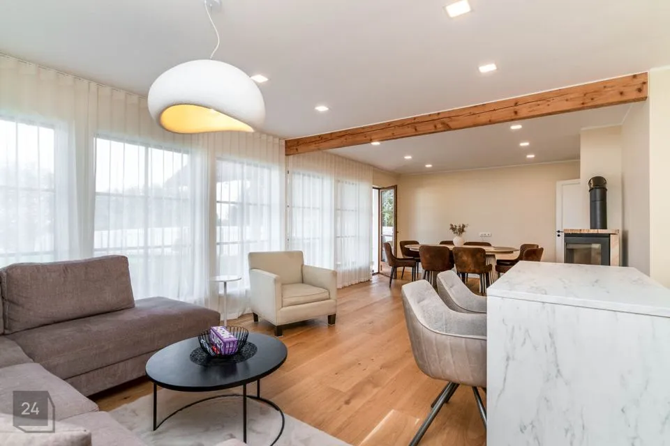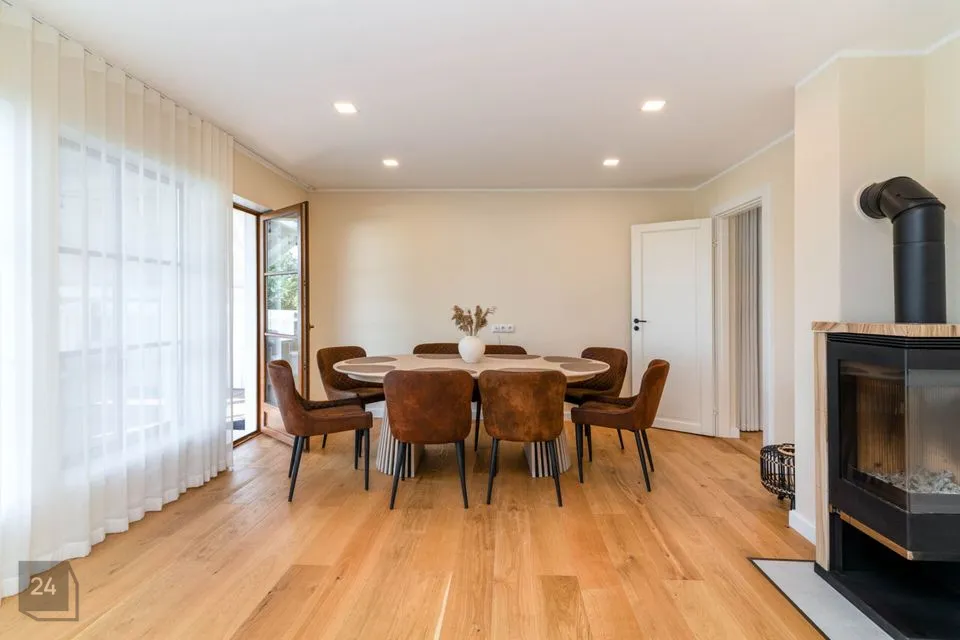 Недавно полностью отремонтирован – использованы качественные и натуральные материалы Полы из натурального однополосного дубового паркета Облицованные поверхности изготовлены из прочного цельнокаменного материала В интерьере доминируют дерево и натуральные тона, создавая уютный и величественный интерьер Источником отопления является воздушно-водяной тепловой насос (теплый пол на первом этаже, дизайнерские радиаторы на втором этаже) Дополнительно камин, который добавляет тепла и атмосферы