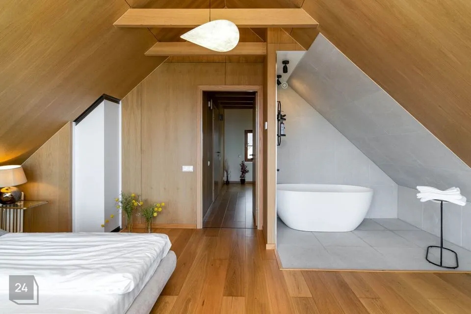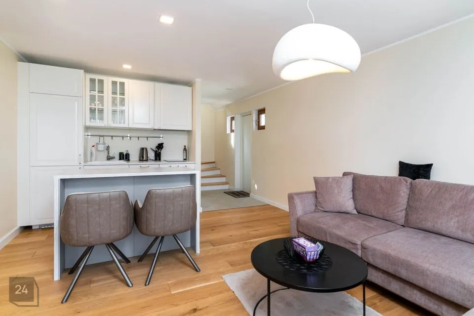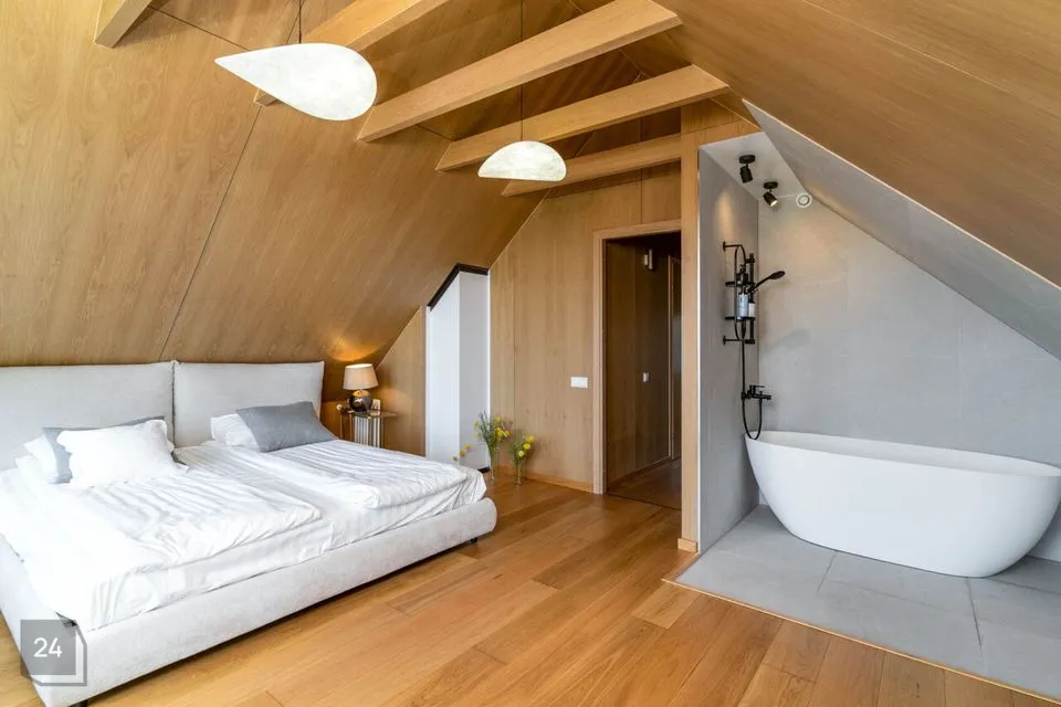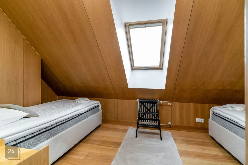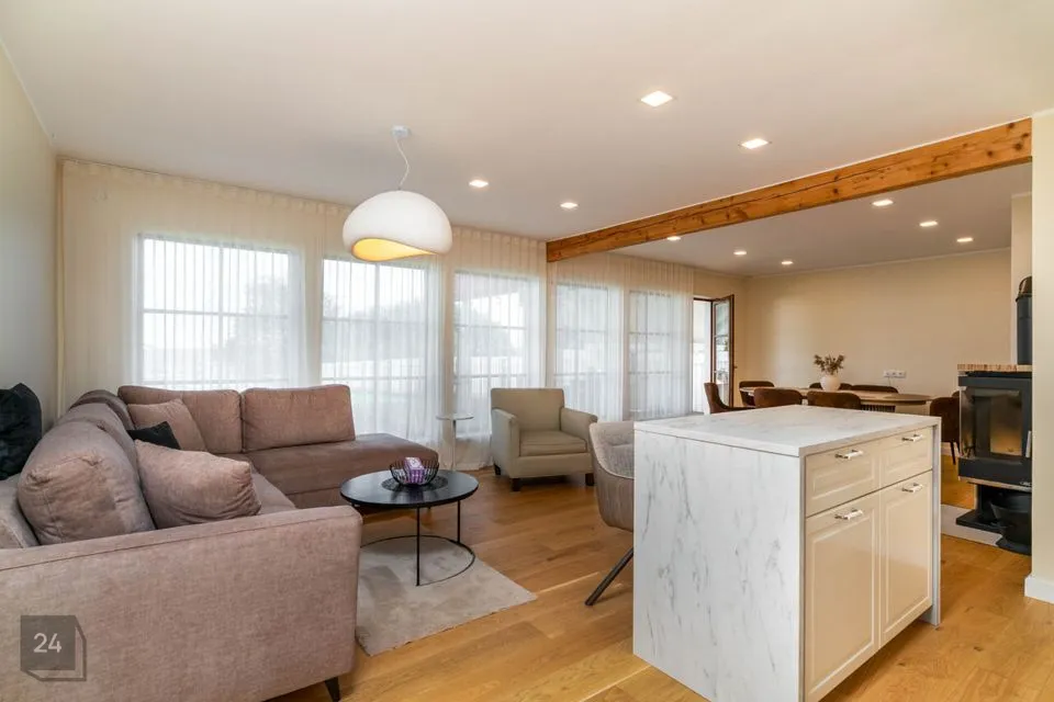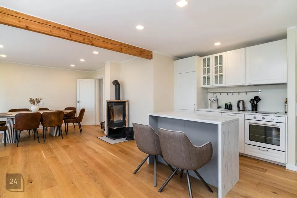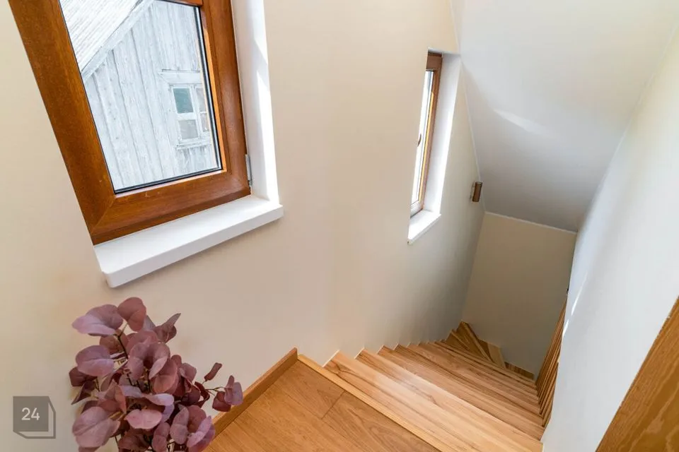 Недавно полностью отремонтирован – использованы качественные и натуральные материалы Полы из натурального однополосного дубового паркета Облицованные поверхности изготовлены из прочного цельнокаменного материала В интерьере доминируют дерево и натуральные тона, создавая уютный и величественный интерьер Источником отопления является воздушно-водяной тепловой насос (теплый пол на первом этаже, дизайнерские радиаторы на втором этаже) Дополнительно камин, который добавляет тепла и атмосферы