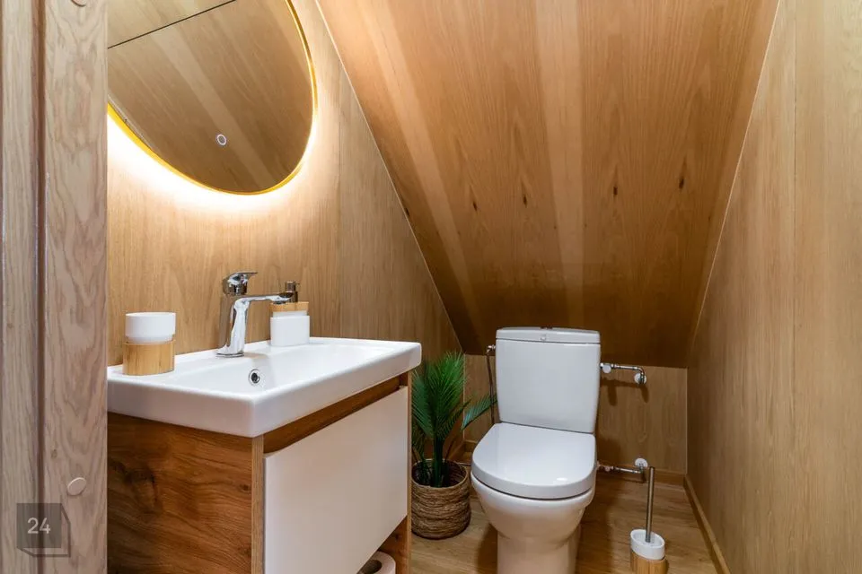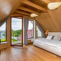 * Отдельный туалет * Кладовая * Детская комната с двумя отдельными кроватями * Главная спальня с романтическим стеклянным балконом, с которого можно наслаждаться видом на озеро * В главной спальне – приватная ванная комната с душем и каменной ванной