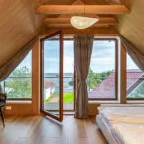 * Прихожая * Туалет и душевая * Спальня (широкая кровать и гардероб) с выходом на террасу * Просторная гостиная с открытой кухней, откуда открывается вид на озеро и выход на террасу * Большая терраса с крышей, оборудованная террасной мебелью