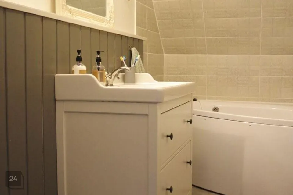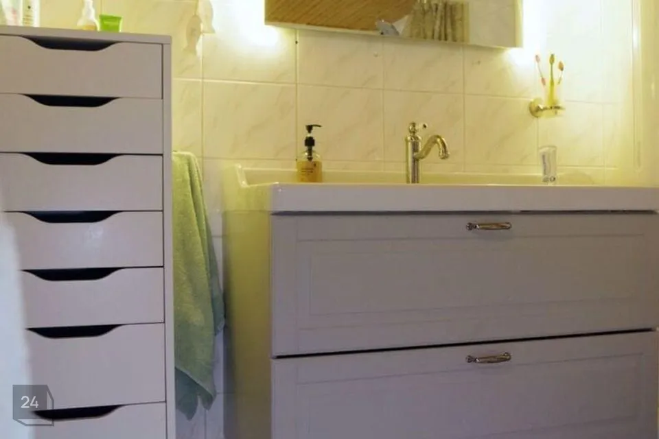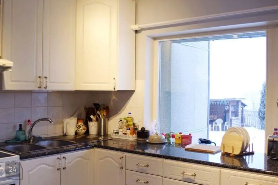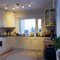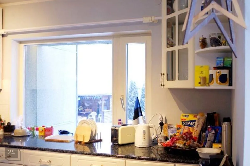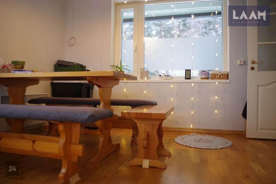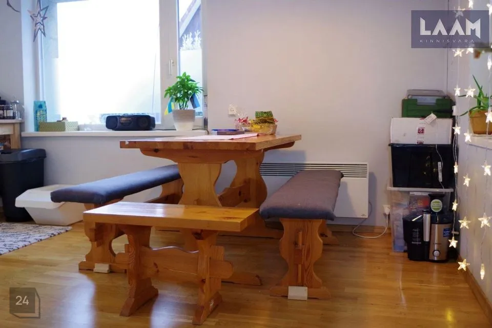 Köögis on L kujuline kööginurk koos köögitehnikaga, lisaks mahub kööki suur laud toolidega.