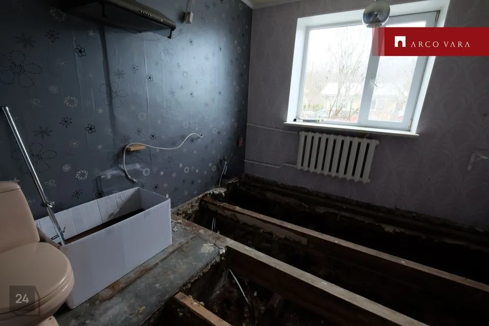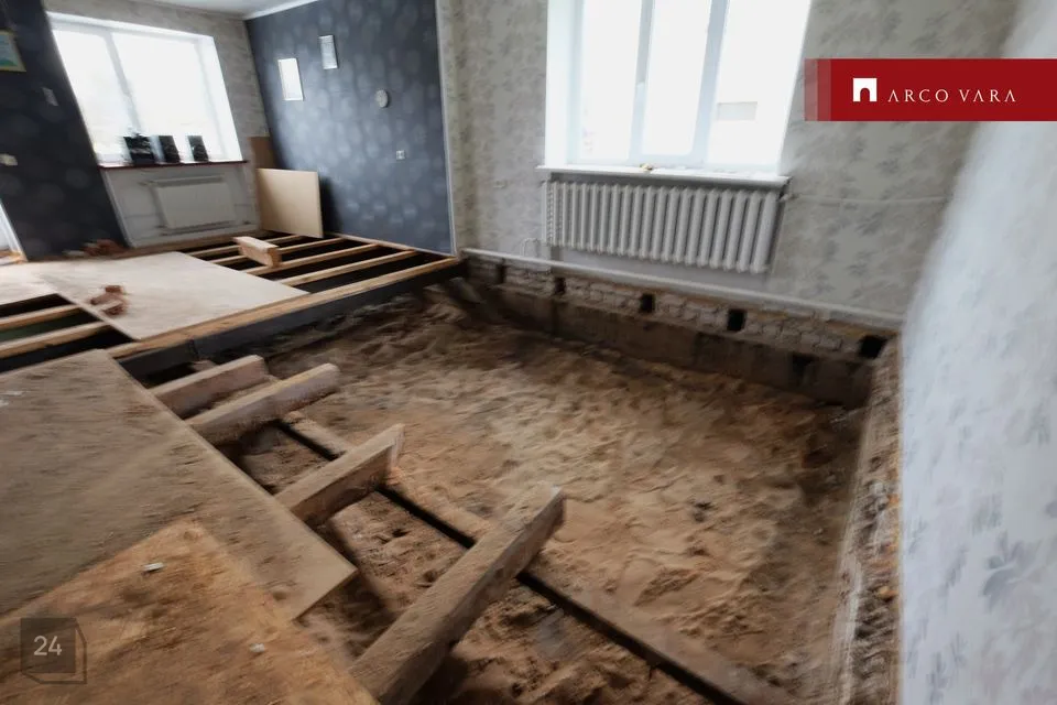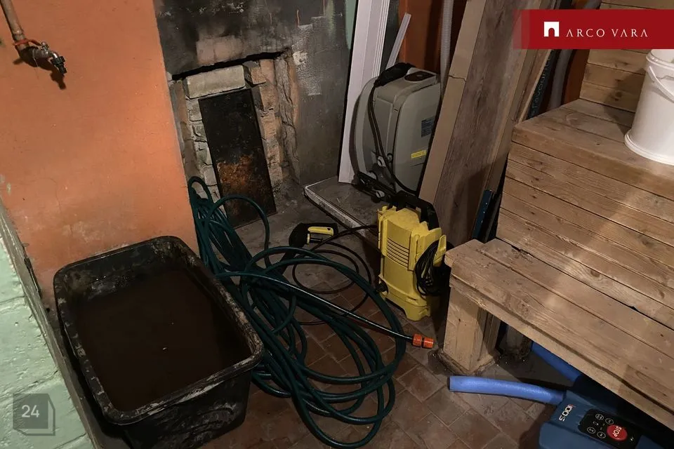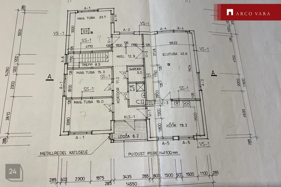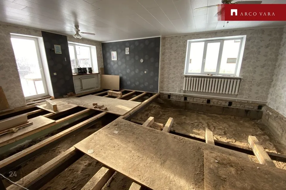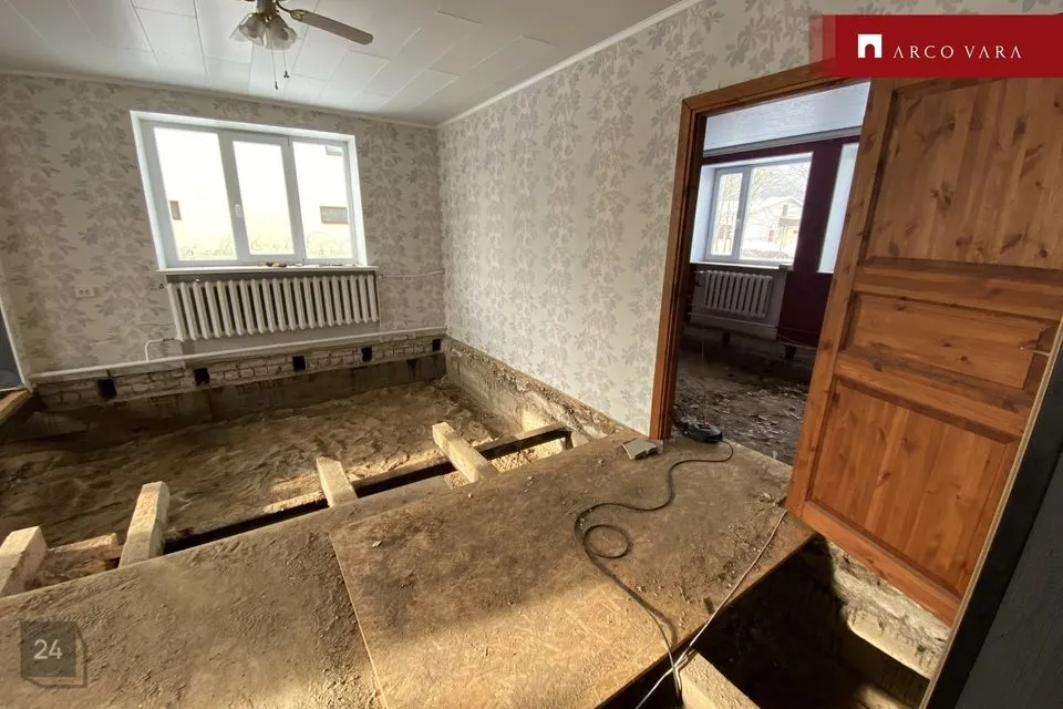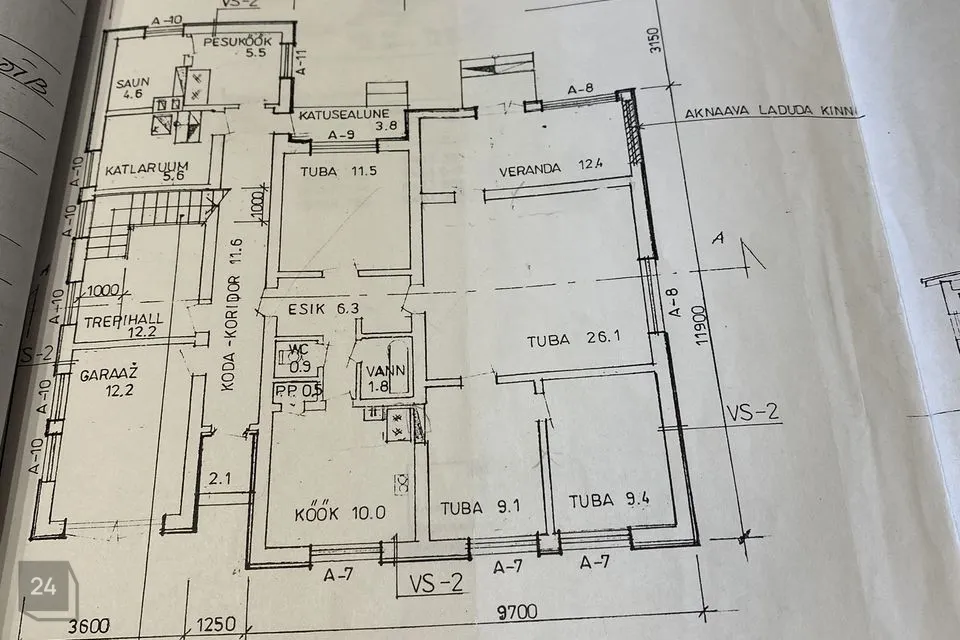 I korruse ruumide planeering - trepikoda, esik, köök, WC, duširuum, 3 tuba, garaaž, kütteruum, pesuköök, saunaruum, trepihall (kõik ruumid vajavad remonti), sisehoovi avaneb avar terrass.