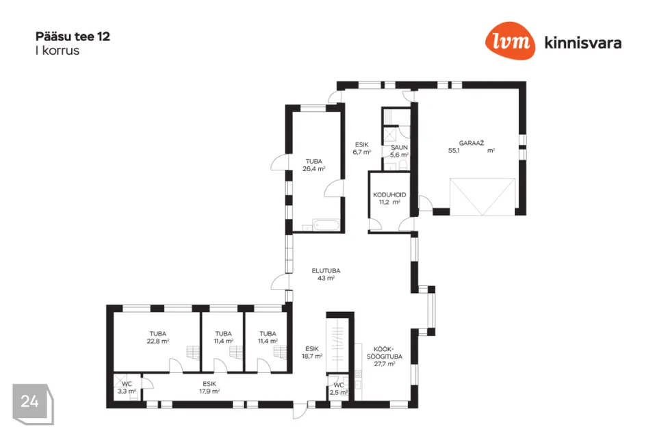 Maja üldpind on 310,7 m², millest köetav eluruumide pind on 255,6 m² + garaaz kahele autole 55 m².