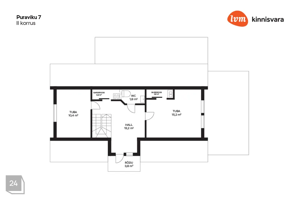 kaks magamistuba lükandustega garderoobidega, trepihall, wc. Kaldlagedega magamistubade ruutmeetrid arvestatkse 1,6 m kõrguselt, mis tähendab, et põrandapinda on rohkem.