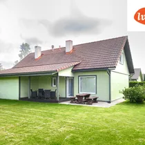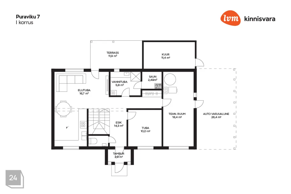 esik, elutuba-köök, mis avaneb maja taha õhtu-päikese poolsele terrassile; üks magamistuba, wc, puukütte-kerisega saun, vannituba, tehnoruum-panipaik.