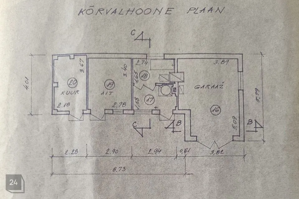 KÕRVALHOONE 43,9 m2 - on esialgse planeeringuga, täna kasutusel kuuri/panipaigana -võimalik ehitada ühte osasse saun.