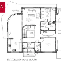 I korrusel paiknevad tuulekoda, esik/trepihall, köök/söögituba//elutuba, kabinet, saunaruumid, wc, majapidamisruum, garaaž ja tehnoruum.