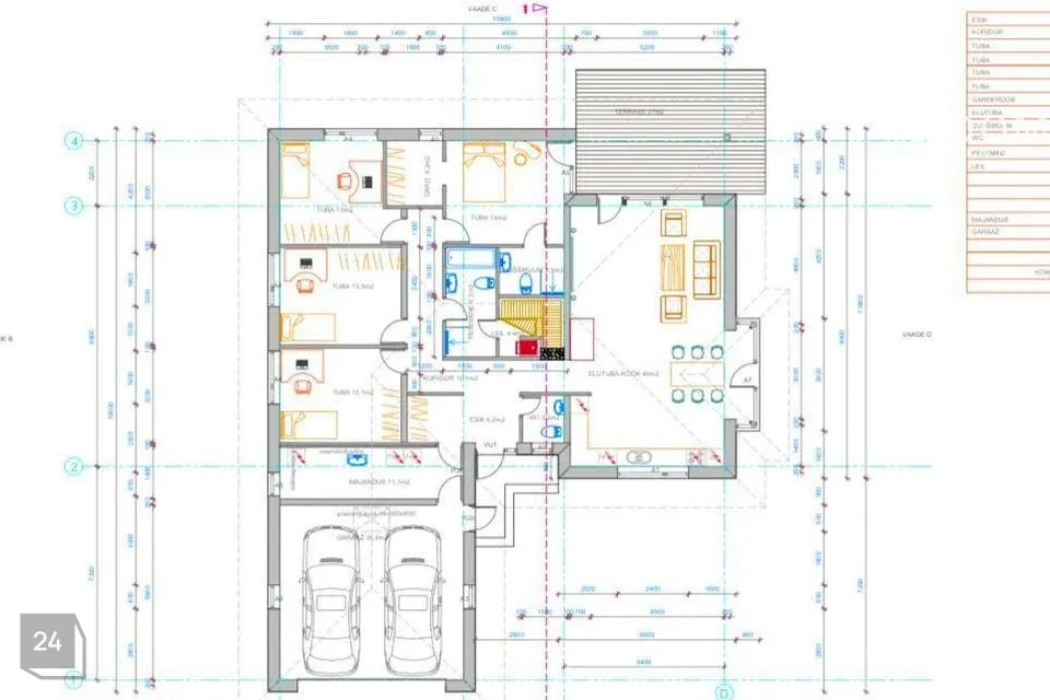 PLANEERING – eraldi sissepääsuga 2 kohaline garaaž, esik, avatud köök-elutuba väljapääsuga terrassile, 3 eraldi asetsevat magamistuba, tehno- ja majapidamisruum ning saunaruumid.