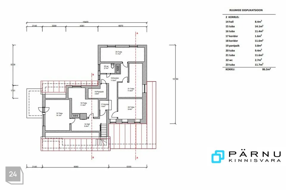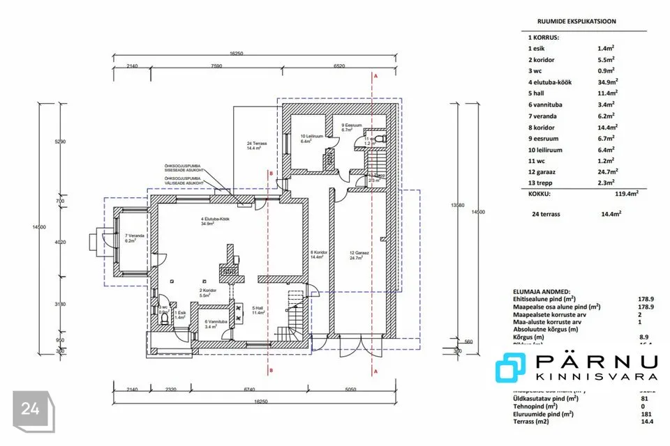 Elamu suletud netopind on 262 m2, millest 181 m2 on köetav pind, 24.7 m2 garaaž ja 56.3 m2 betoonkelder.