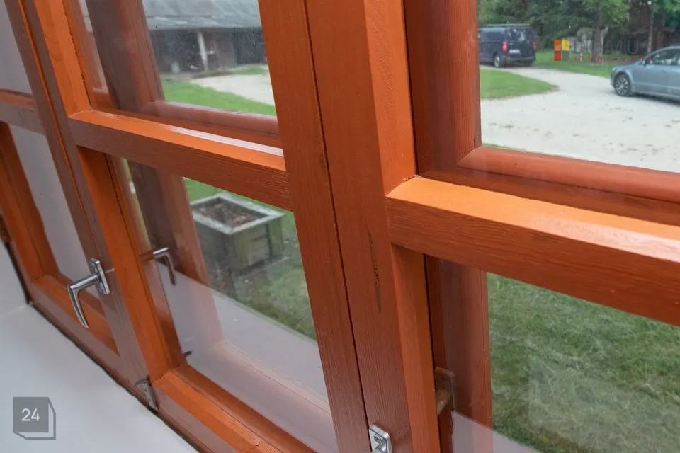 Aknad: Lihtsad, toonitud (oranž) talupoja tüüpi, riivide ja kremoonidega tuulutamist võimaldavad puitaknad.