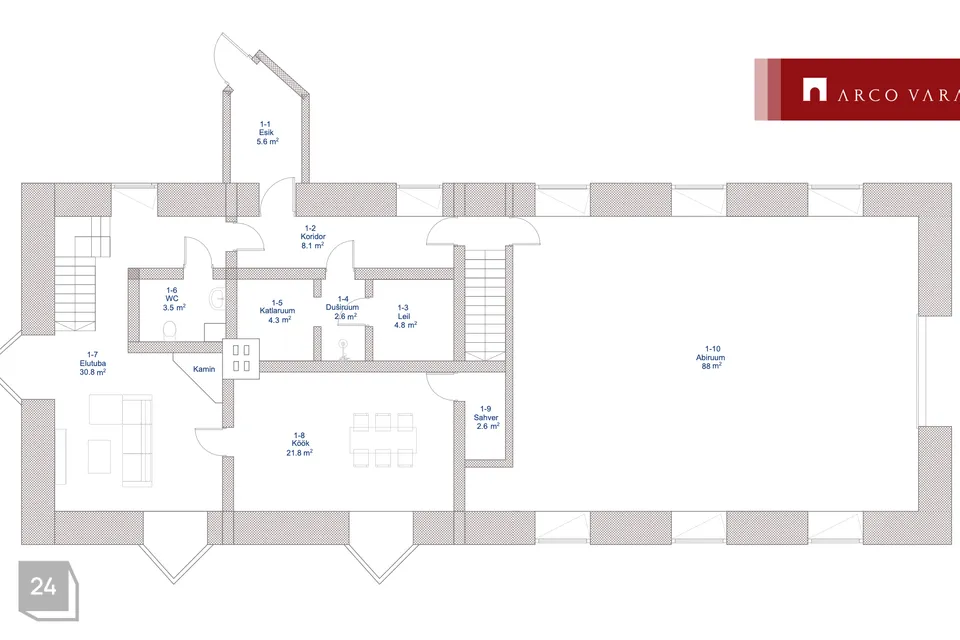 - eraldi / mitte läbikäidav suur köök 21,8m2, millelt pääs terrassile, sahver-panipaika ning ka vajadusel abiruumi (garaaži)