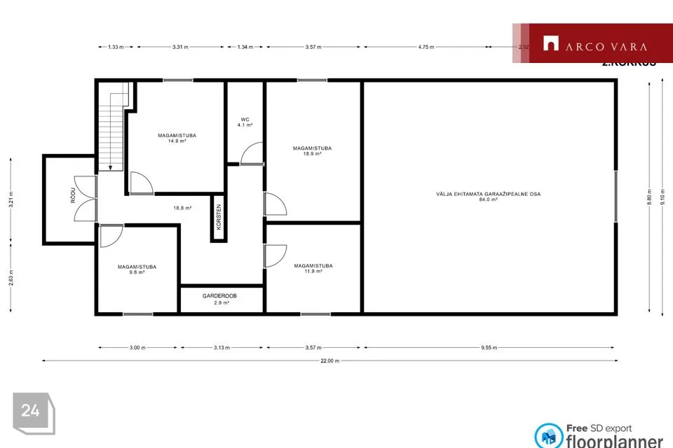 2.KORRUSEL (põrandapind ~84m2 + 88m2):