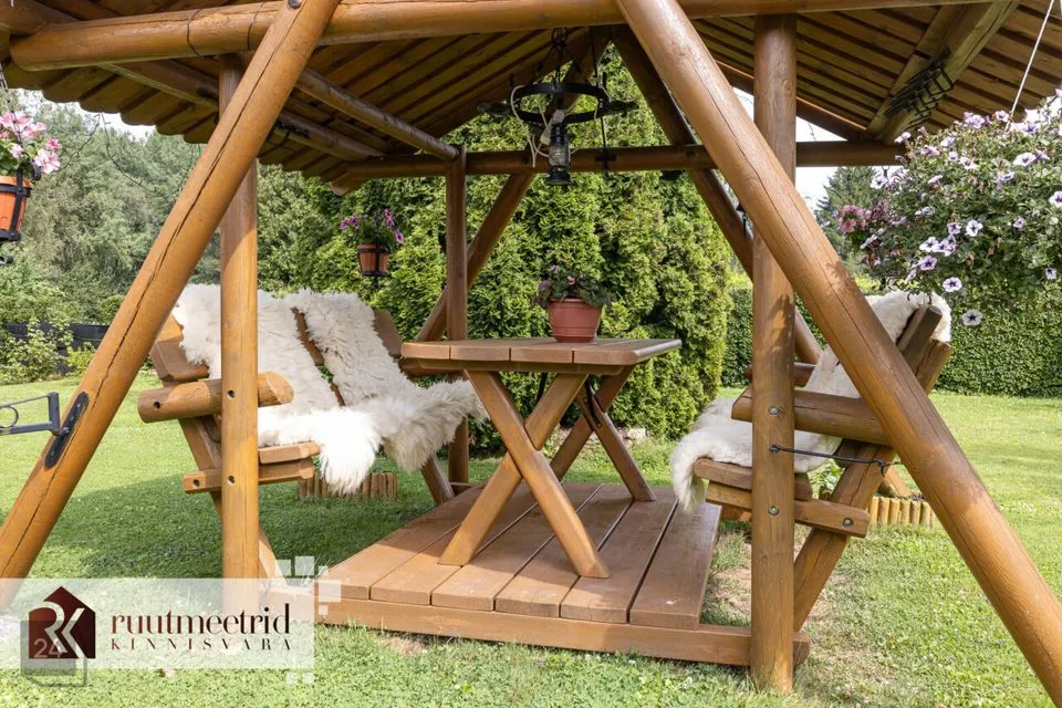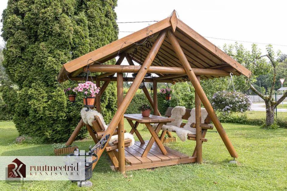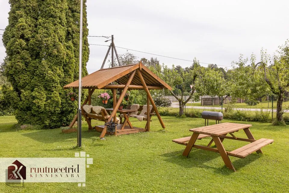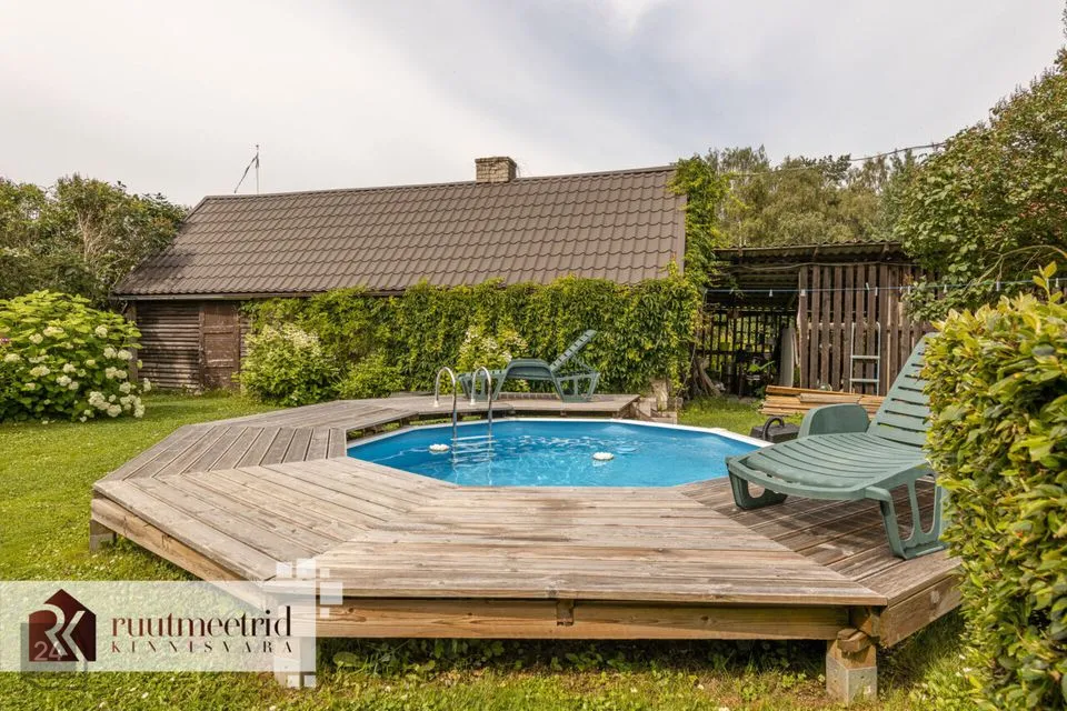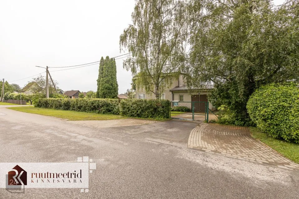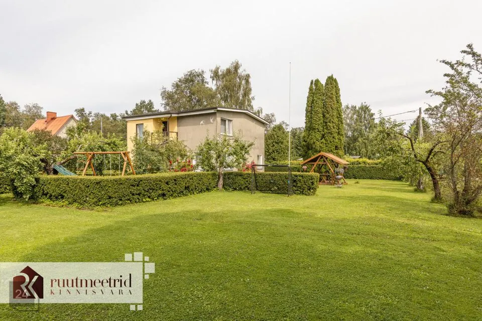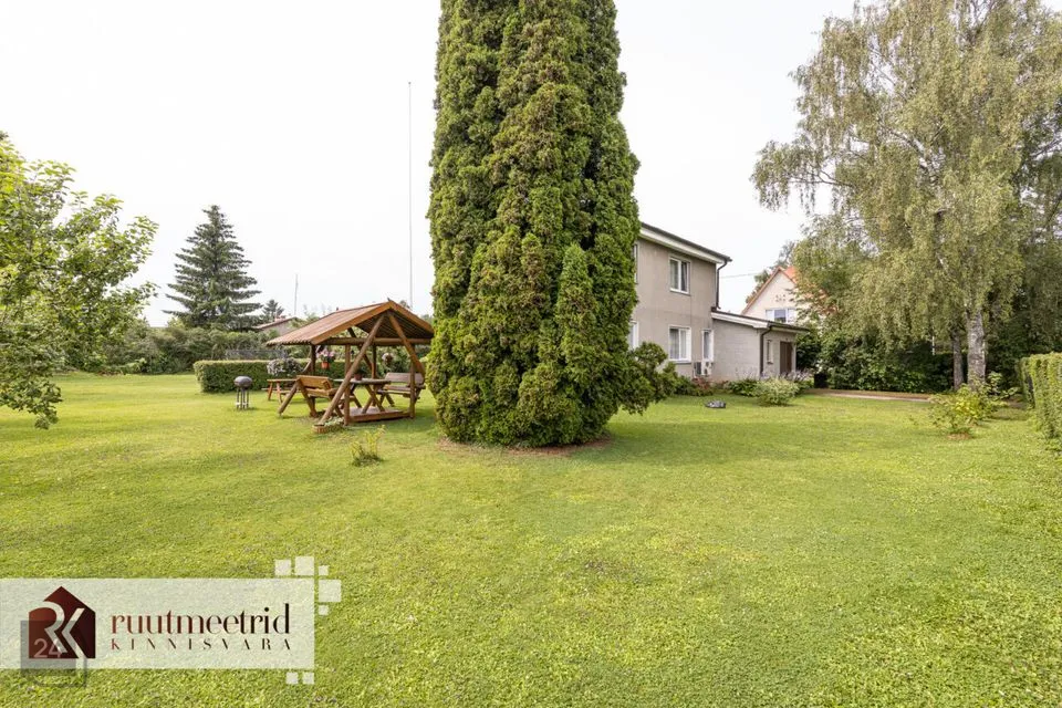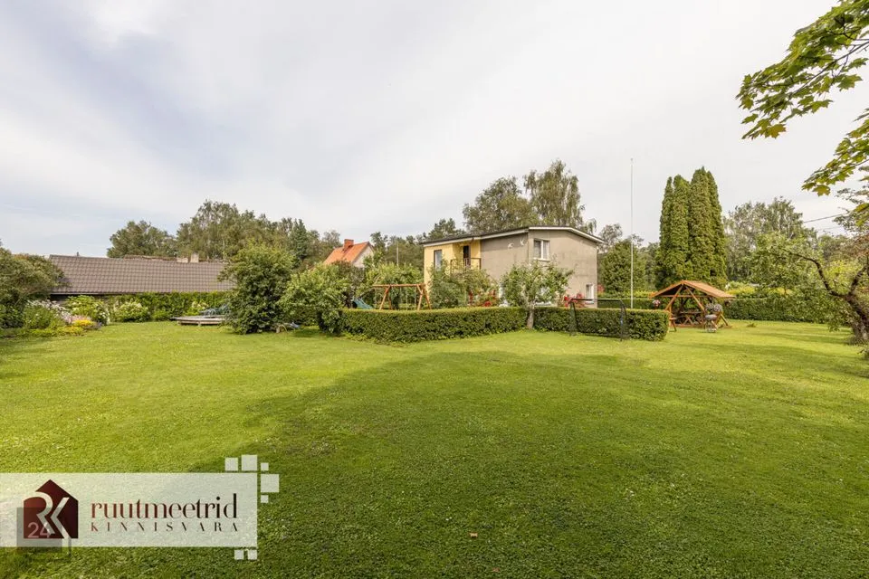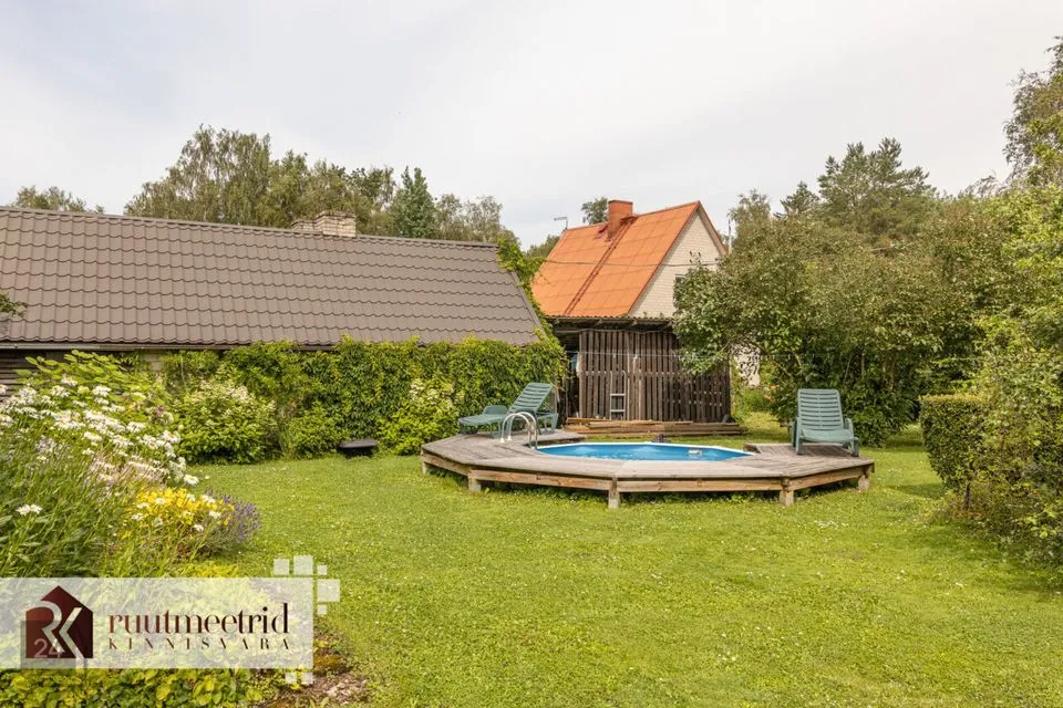 Suurel, 1495 m2 kinnistul on naabrid vaid kahel küljel ja on väga rahulik koht elamiseks. Kinnistut liigendavad erinevad puud ja põõsad, mis tekitavad erinevad alad koduõue nautimiseks ja mis kinnistu äärtest loovad privaatsuse naabritega. Kinnistul on lisaks peamajale ja garaažile ka kõrvalhoone, mis koosneb lihtsamast puukuuri osast ja endisest saunast koos katusealuste tubadega, mis on võimalik renoveerida ja uuesti kasutusele võtta. Hoovis on lisaks veel ka korraliku puhastussüsteemi ja enda terrassiga bassein, mis meeldib kuumal suvepäeval nii väikestele kui suurtele, katusega palkidest aiakiik ja väike mänguväljak liumäe ning kiigega. Niitmise eest kannab hoolt robotniiduk. Maja asub kenade hoovidega rahulikus piirkonnas Aruküla keskuses ja ka antud maja krunt on tõeline väikelinna paradiis!