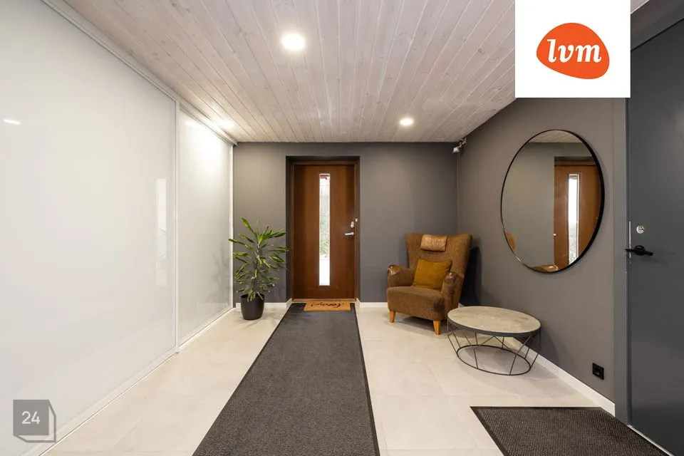 on esik, kus on sisseehitatud garderoob; eraldi sissekäiguga garaaž; tehnoruum; majapidamisruum/külalistetuba; sauna eesruum, kus on kamin ja kust pääs klaasitud terrassile; leiliruum