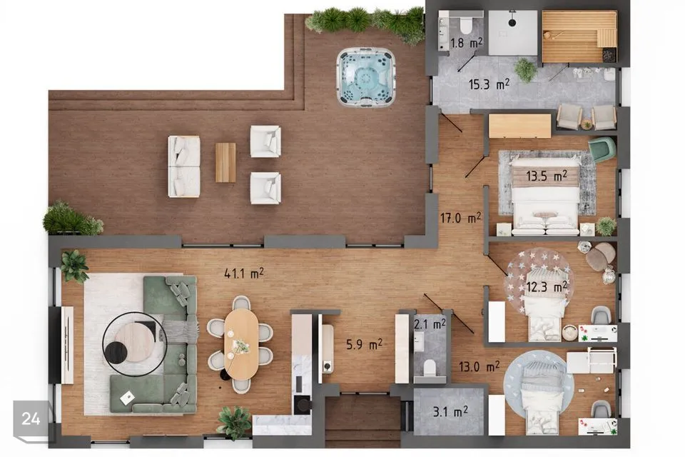 Planeering on sobitatud pere igapäevavajadusi silmas pidades – ühel poolel asuvad magamistoad ja privaatne puhkeala, teisel poolel avar elutuba koos köögiga, kus on ruumi koosolemiseks ja külaliste vastuvõtmiseks.