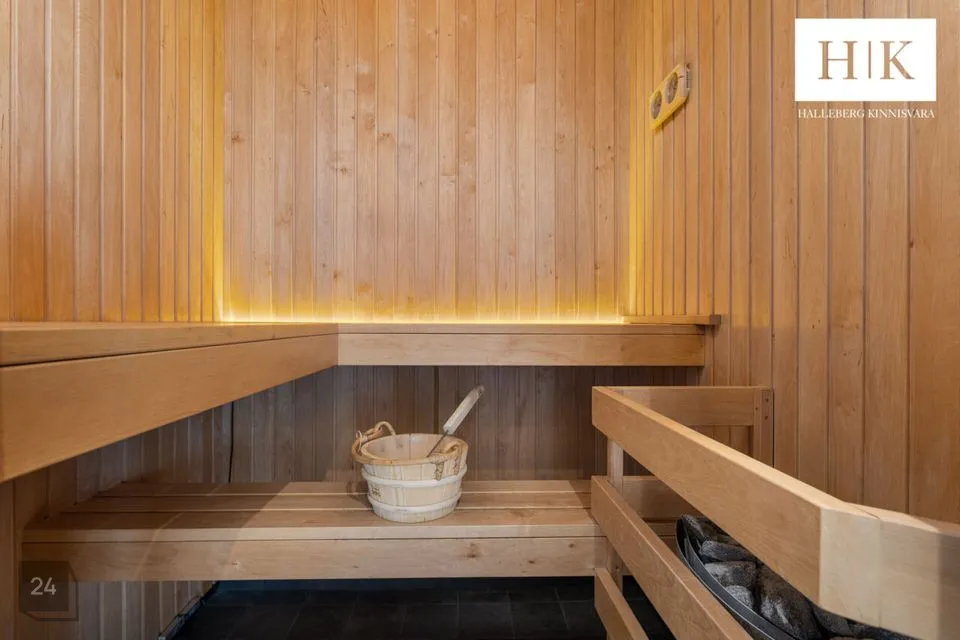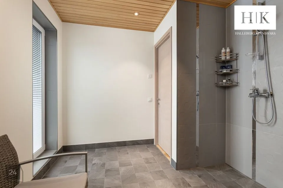 Saunast pääseb otse terrassile, saunaruumis olemas 2 dushi. Garaaži suurus on 21,4m2, olemas põrandasoojendus, sissepääs lisaks ka esikust. Tehnoruum/panipaik asub kohe garaaži kõrval. Autovärav ja garaažiusk avanevad puldist. Mõlemal majaosal on oma eraldi auto- ja jalgvärav.
