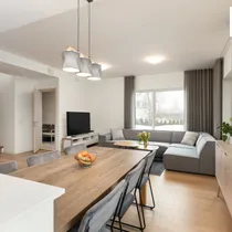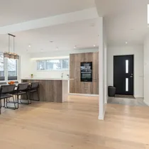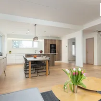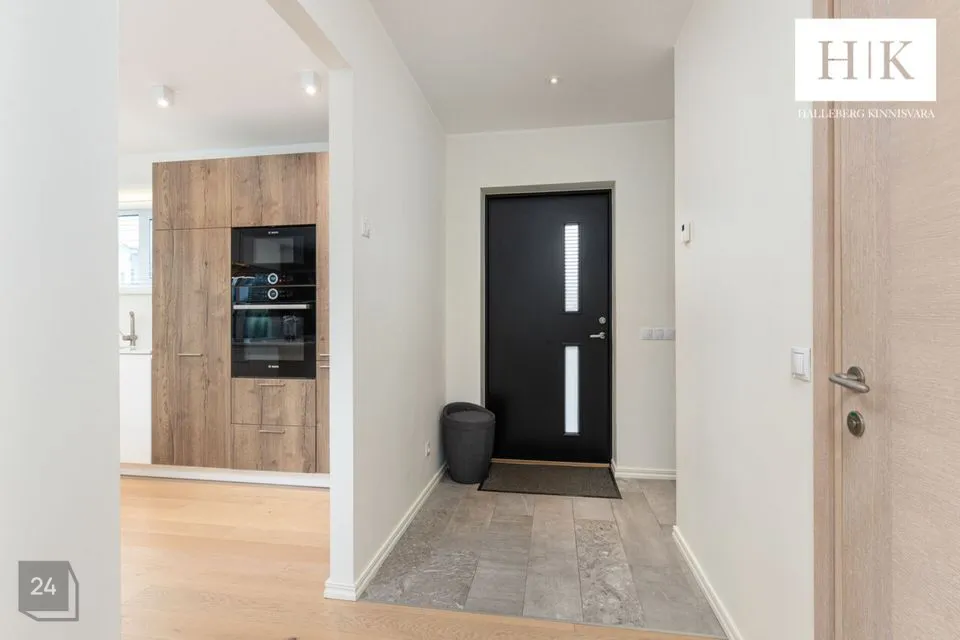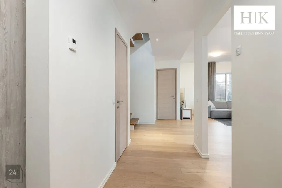 Põrandad on kaetud heleda tammeparketiga ja kvaliteetsed siseuksed heledast tammespoonist (magnetlukustitega).