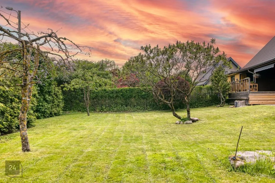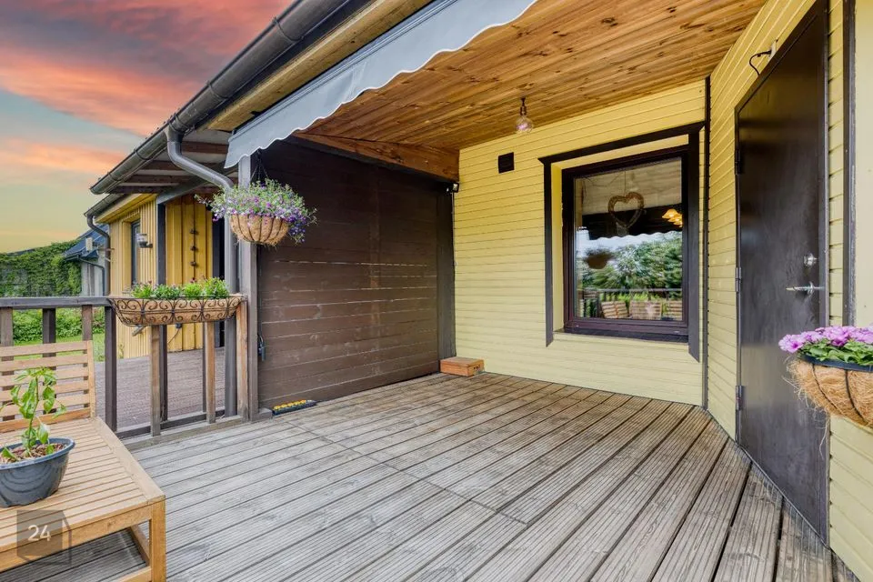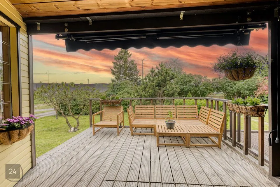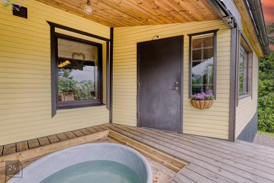 Toa pikenduseks on eriti mõnus ja päikseküllane terrass kohe maja ees, kus on kavalalt ja ruumisäästlikult peidetud ka terrassilaudade alla kümblustünn mõnusate õhtute nautimiseks pere või sõprade seltsis ning ühisteks grilliõhtuteks 888 m² suurusel kinnistul, kust leiab ka auto varjualuse ja panipaiga aiatööriistade, kaminapuude ja muu kraami jaoks.