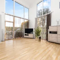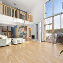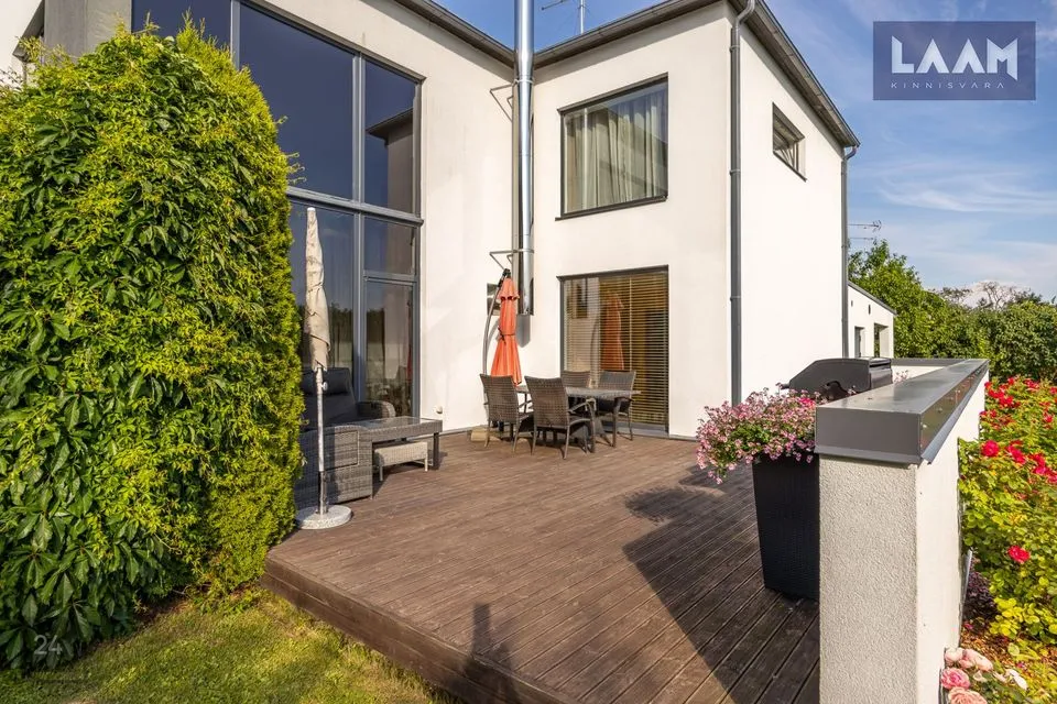 Naturaalse tammeparketiga elutuba kõrgub läbi kahe korruse pakkudes maast laeni akendega tõeliselt avarat miljööd. Mõnusat keskkonda võimendab puuküttega kamin. Aknaga köögis on olemas kogu kaasaegne tehnika, sealhulgas mahukas kahepoolne külmik. Kööki pääseb mugavalt nii esikust kui elutoast.