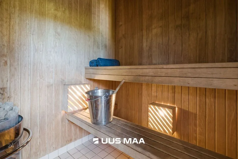 Lisaks avarale elutoale asub esimesel korrusel ka 10,2 m² suurune kabinet, mida saab kasutada kontorina või lisamagamistoana. Esimesel korrusel on wc eraldatud vannitoast, saun, millest pääseb otse 70 m² suurusele terrassile ja majapidaidamisruum. Terrassil on kümblustünn, mida saab soojaks kütta puudega – ideaalne koht lõõgastumiseks.