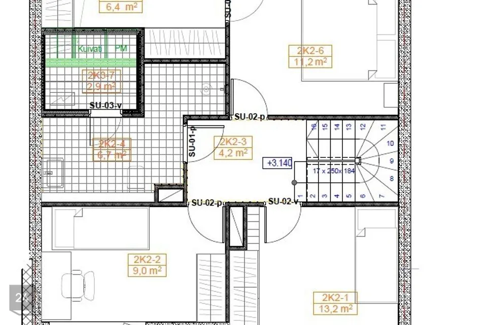 II korrus: 3 magamistuba, garderoob, vannituba, saun.