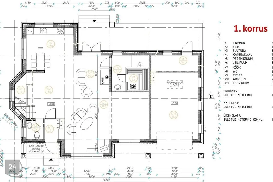 Esimesel korrusel on avar elutuba/söögituba/esik (56,8 m²), eraldi köögi osa (14,8 m²), WC, saunaruumid, panipaik/garaaž ja tehnoruum.
