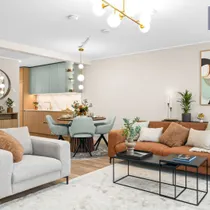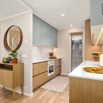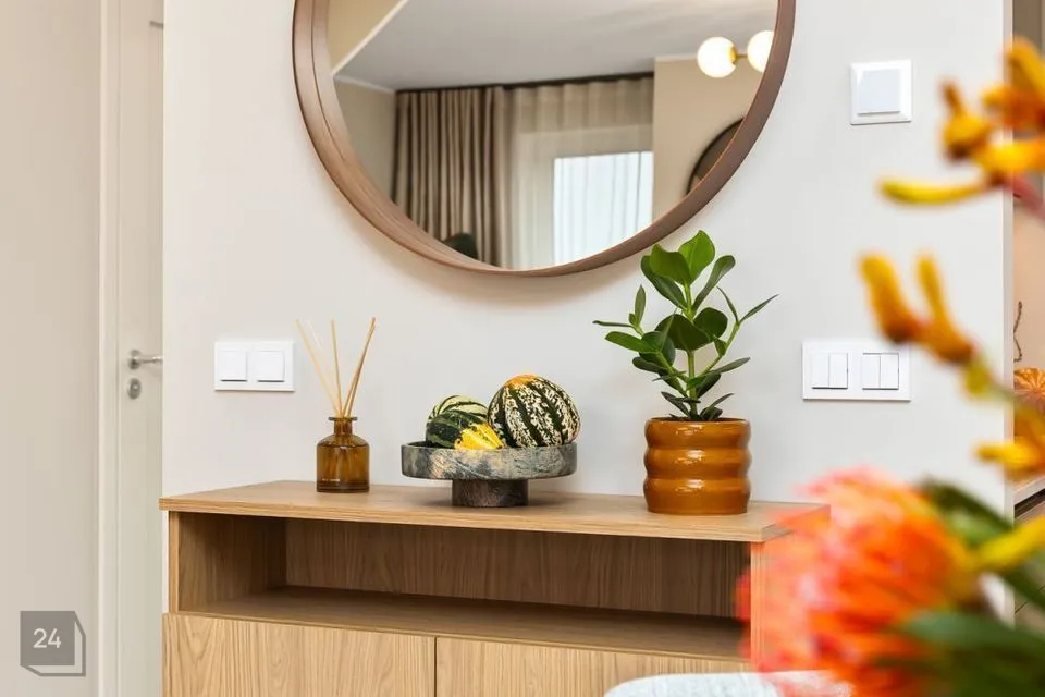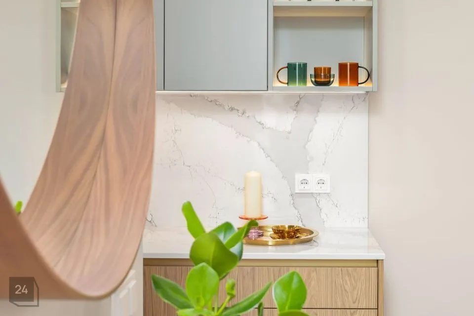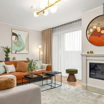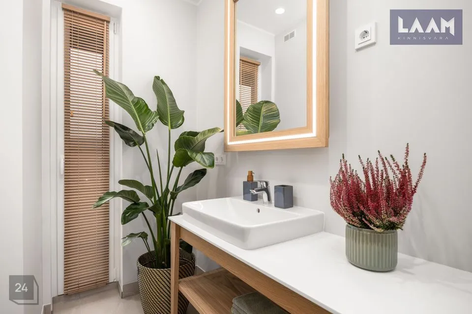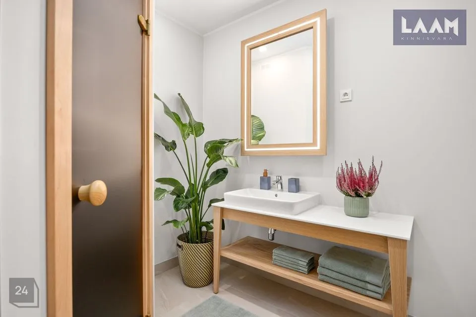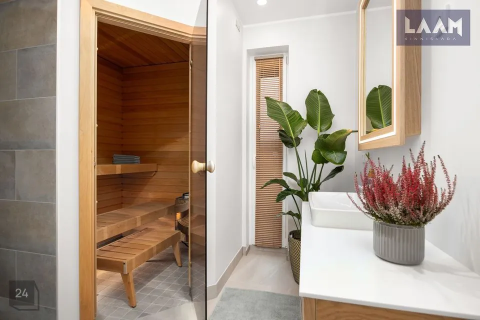•Siseviimistlusega luuakse hubane kodu, kus on mahedad toonid ja kvaliteetsed materjalid. Kasutatud on naturaalset tammepuitparketti, keraamilisi plaate ja SWEDOOR'i mantelservaga massiivuksi. Sanitaartehnika firmadelt DURAVIT ja HANSGROHE.