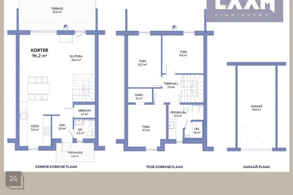Esimesel korrusel asuvad ka esik, majapidamisruum ning WC/duširuum. Teisel korrusel asuvad 3 magamistuba ning saunaga duširuum.