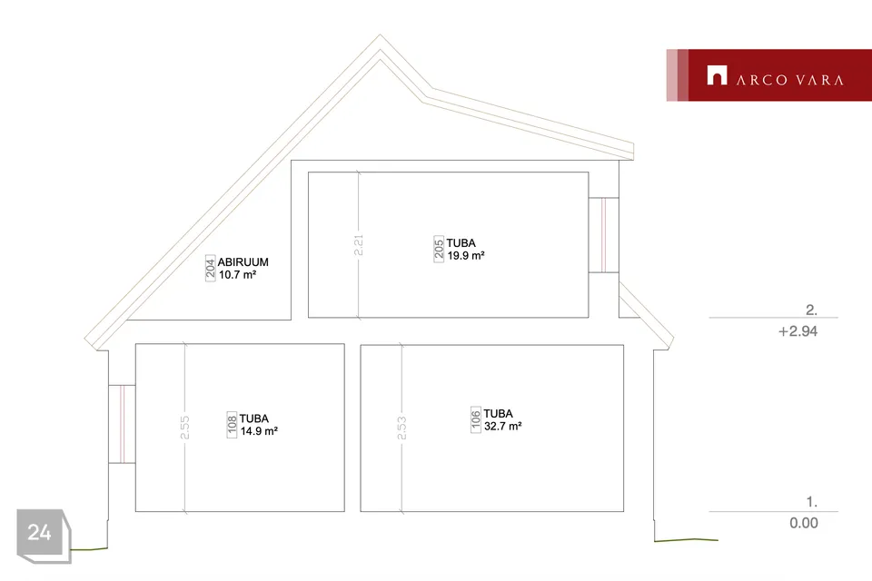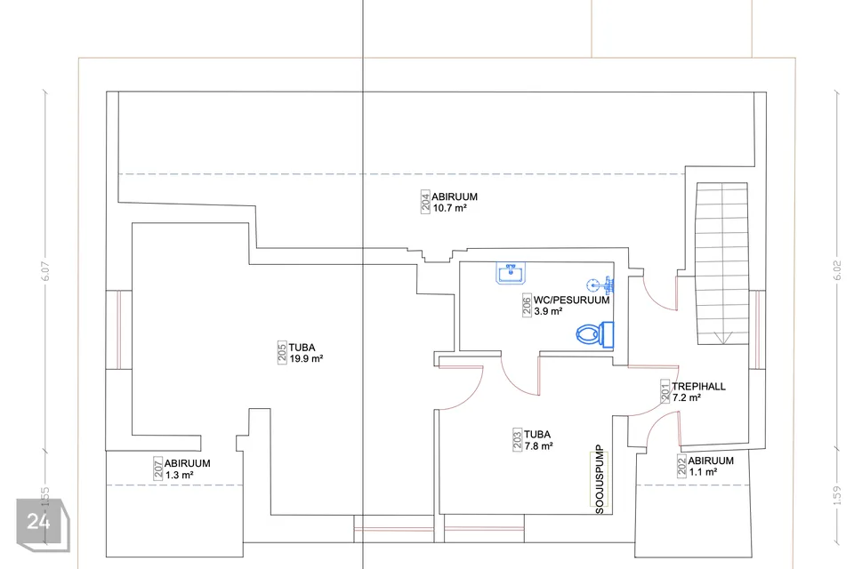 Esimesel korrusel asuvad avar elutuba ning köök, mis moodustavad kodu südame. Samuti paikneb esimesel korrusel üks magamistuba ning wc/dushiruum, kus on boonusena ka võimalus leiliruumi rajamiseks. Korrus kõrgemal on kaks tuba, mitmed abiruumid ning vannituba/WC. Täpsem ruumide paiknemine on näha majaplaanidel, mis on kuulutuse piltide hulgas.