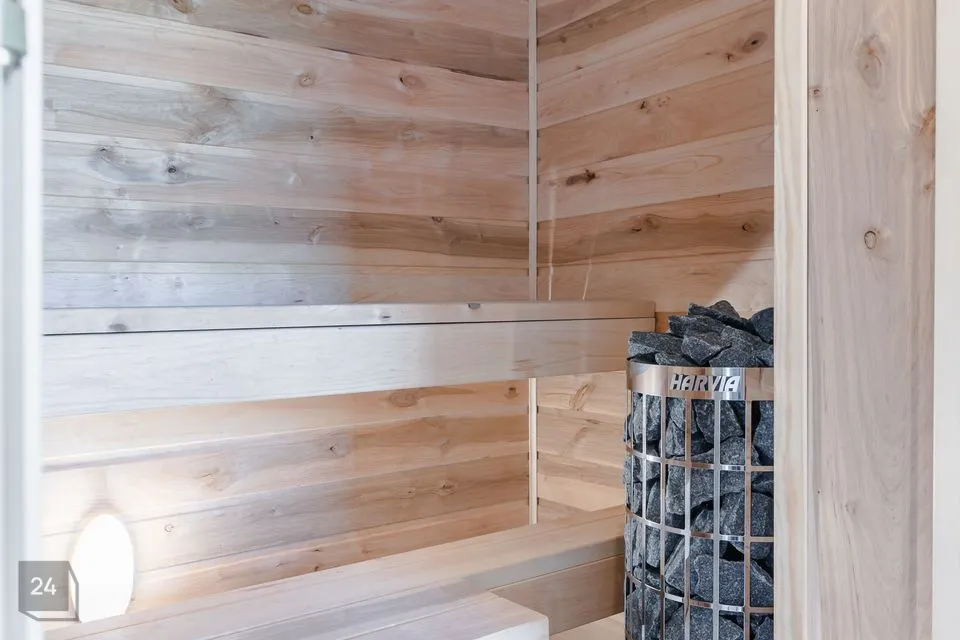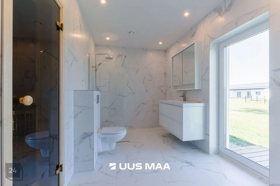 Avar ja funktsionaalne ruumilahendus: esik, avatud köök-elutuba, suur magamistuba, kaks väiksemat magamistuba, wc/duširuum, leiliruum ja sahver.