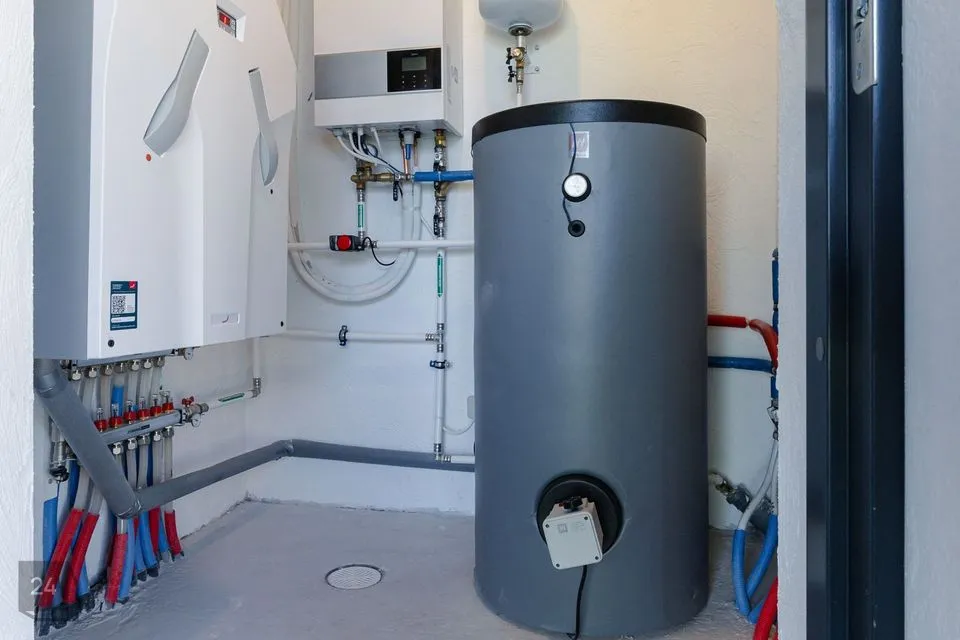 Õhk-vesi soojuspump (Midea M-Thermal Arctic 6kW) ja 180L tarbeveeboiler.