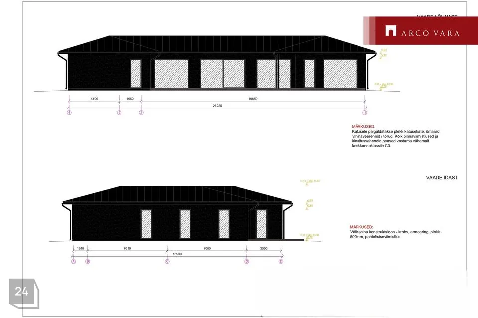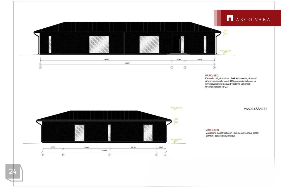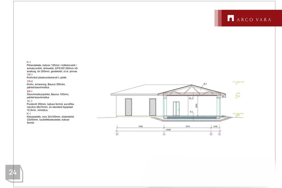 Elamule rajatakse plaatvundament. Seinakonstruktsioonid kergplokist. Välisseina viimistlus krohv. Katusekatte materjal plekk. Aknaraamid PVC ja välisuks soojustatud alumiinium. Hoone põhiküte planeeritakse õhk-vesi soojuspump (vesi-põranadaküte). Hoonet hakkab teenindama soojustagastusega ventilatsioonisüsteem, mis ühendatakse ka soojuspumbaga. Hoovi poole ehitatakse puidust terrass.