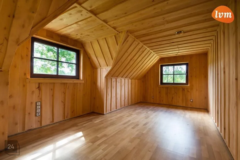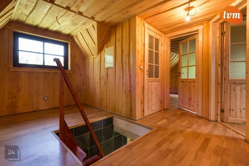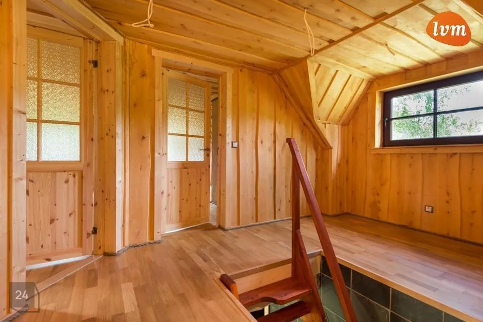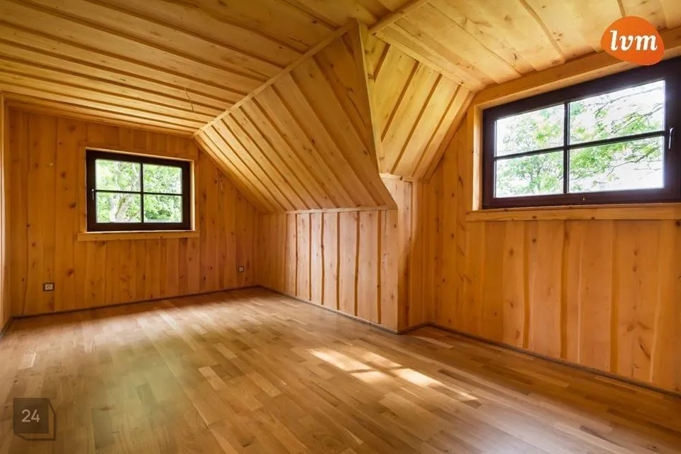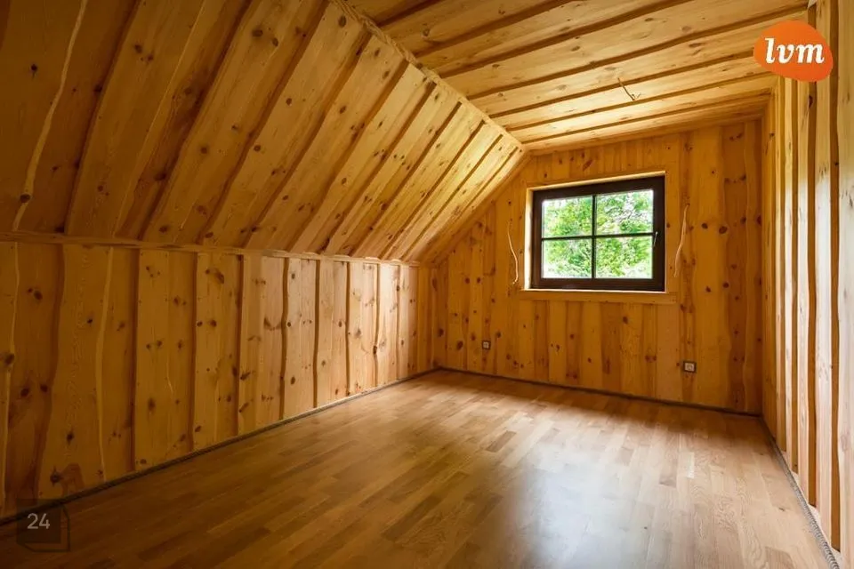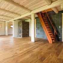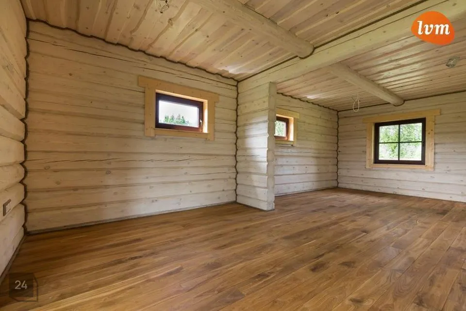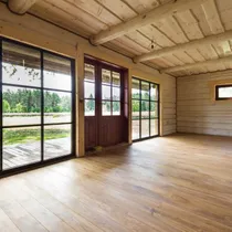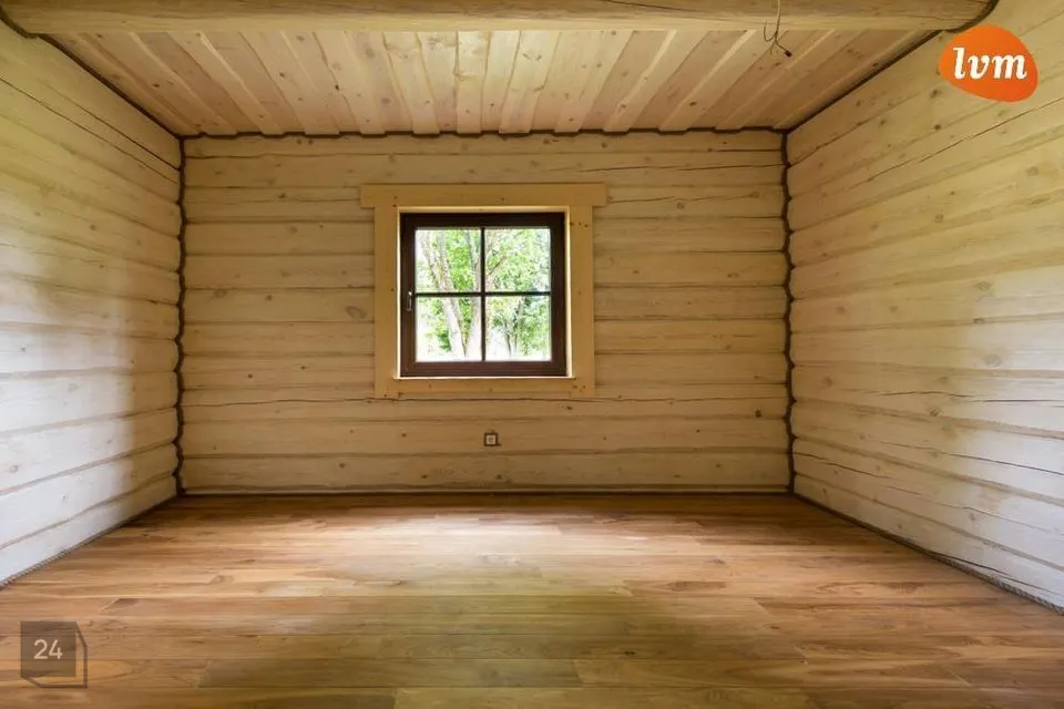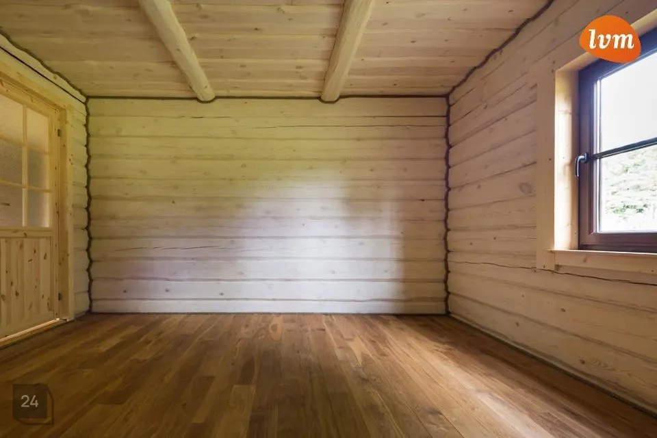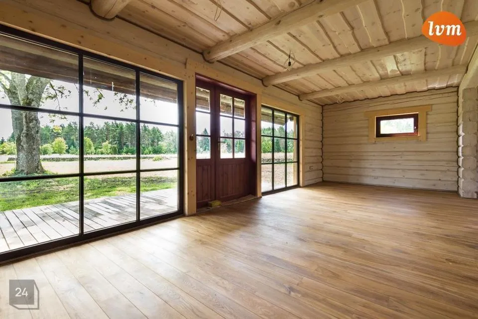 Elutoa põrandal ehedast tammelaudisest valmistatud parkett, seinad ja laed puiduga viimistletud.